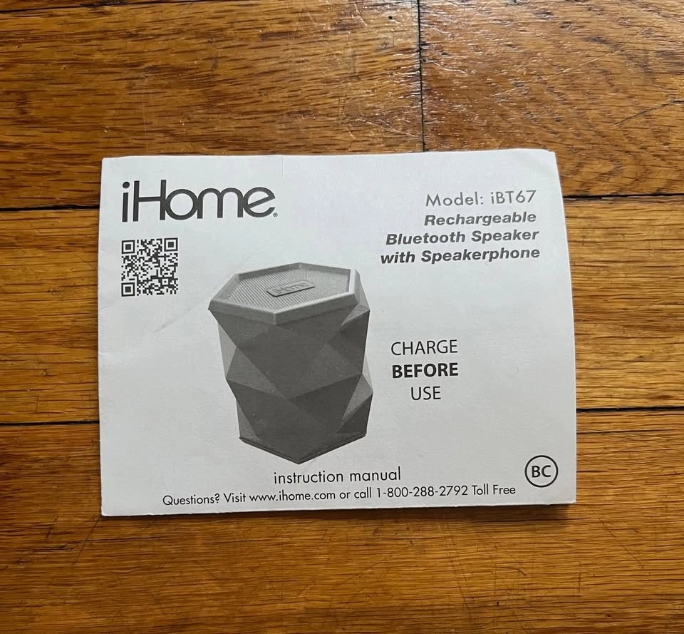 65Blue geometric mini iHome wireless Bluetooth speaker (iBt67) with 8 hours of playtime. Instruction/pamphlet included. Nothing wrong with it, just never used.