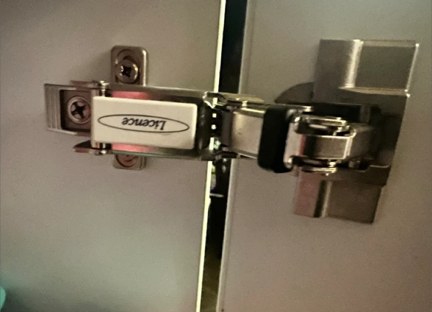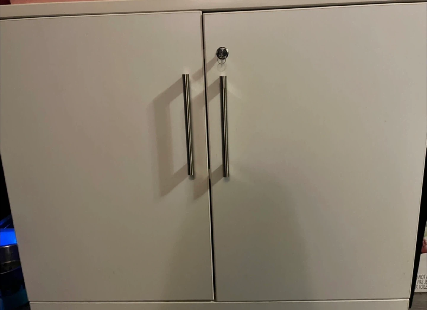 White two-door cabinet with sleek silver handles and a functional lock with key. Hinges appear to be of good quality, indicating durability. This cabinet is great for securing important documents or storing office supplies.