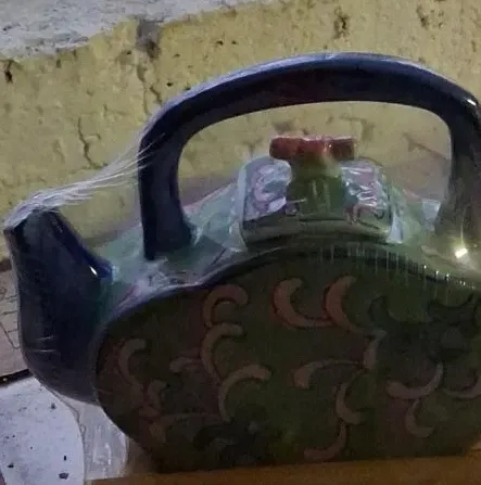 This is a decorative ceramic teapot with a green base and a floral pattern. It features a dark blue handle and a red accent on the lid. The teapot is wrapped in plastic, suggesting it's new or well-preserved. Its design makes it a lovely accent piece.