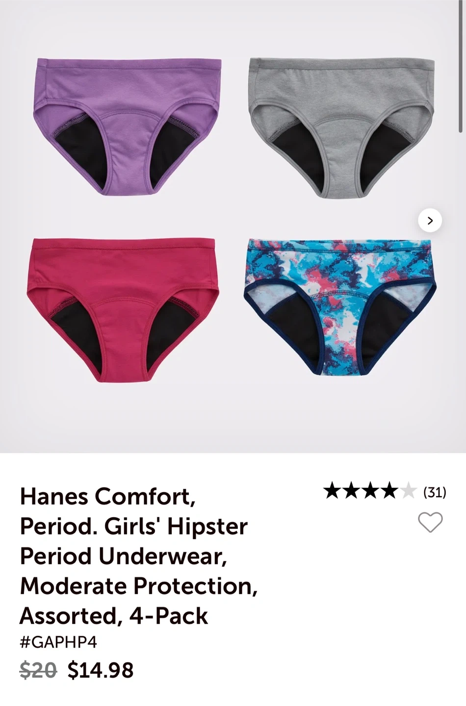 Selling a brand new pack of Hanes Comfort Period girls' hipster underwear! This is a 4-pack with moderate protection. Size 12. The material is 95% cotton/algodon and 5% spandex/elastano