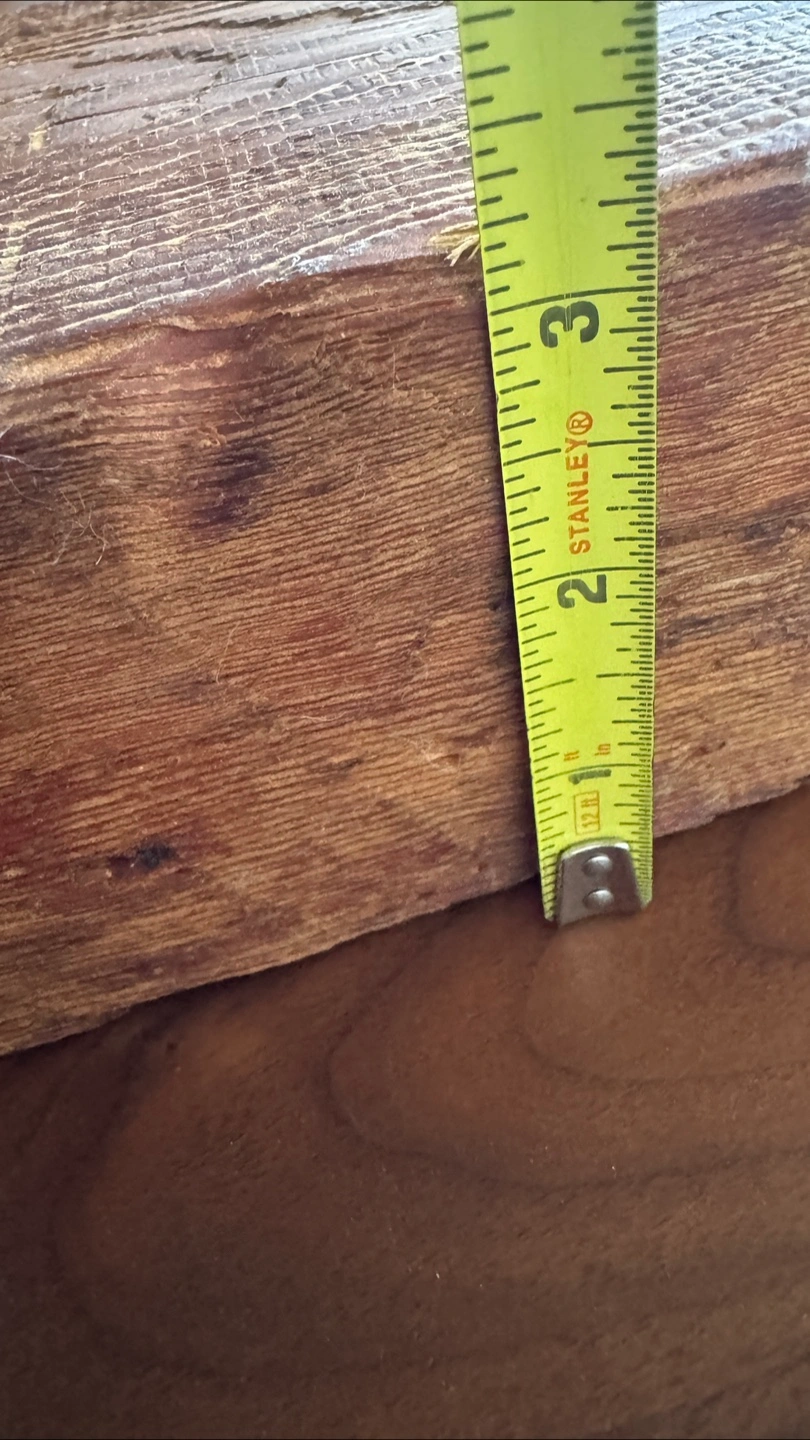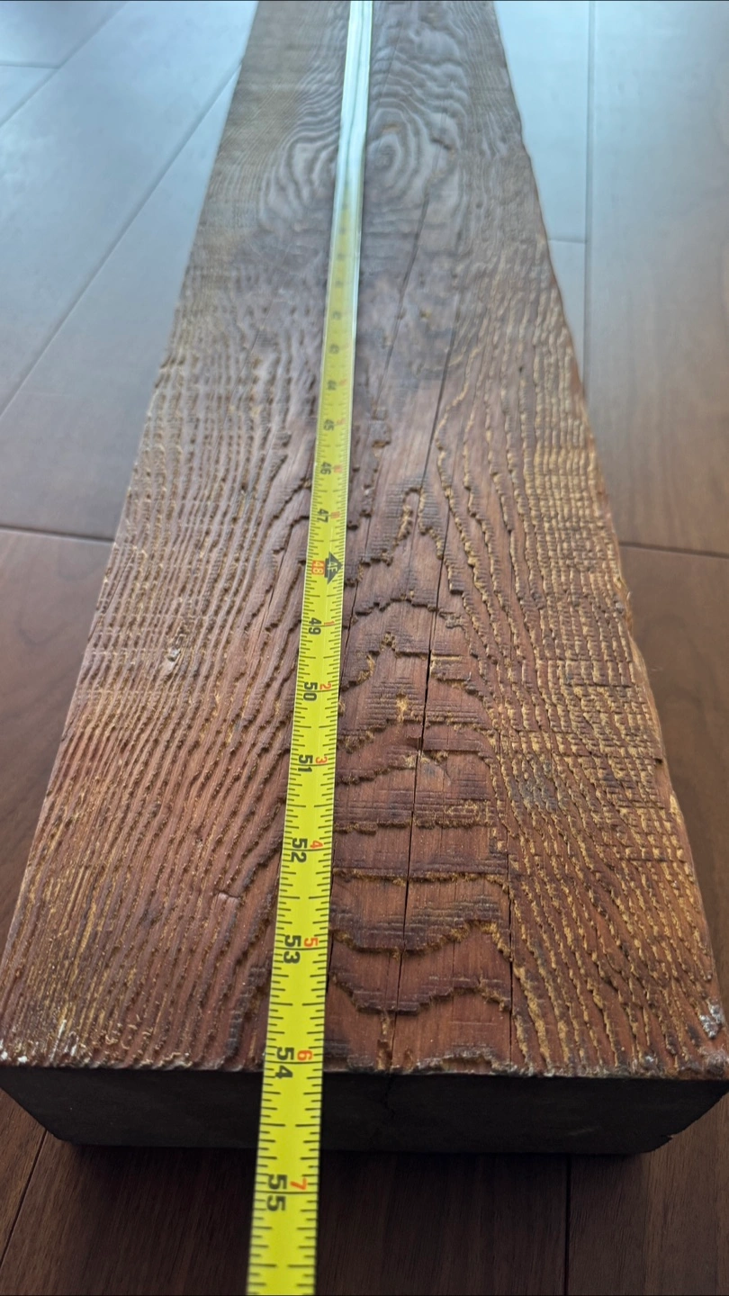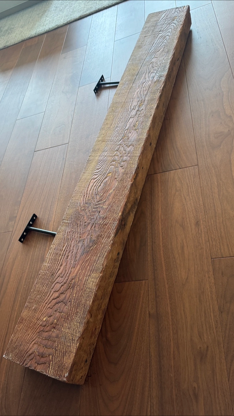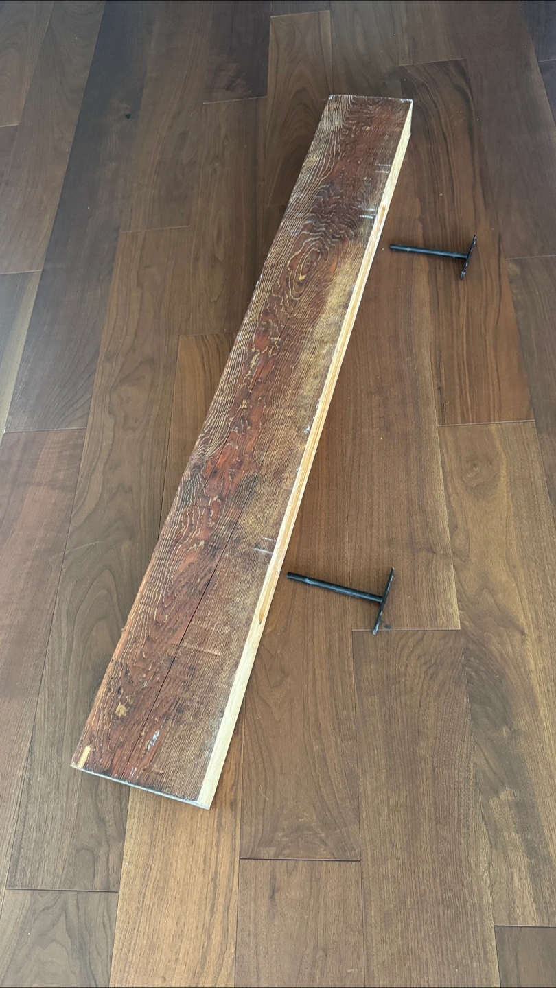 Rustic reclaimed wood shelf. Measures approximately 54 inches long. Includes two black metal brackets for easy installation. Perfect for a farmhouse or industrial style home.