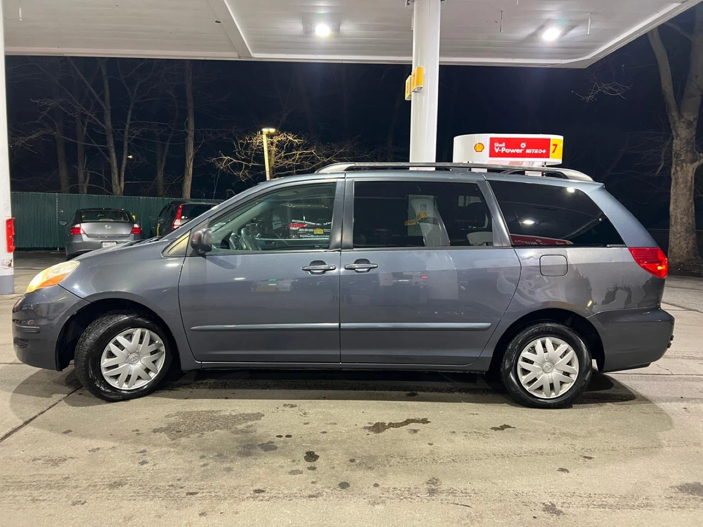 This is a gray Toyota Sienna minivan. It features a spacious interior and is perfect for families. The vehicle has a roof rack for extra storage. It's a reliable option for everyday transportation.