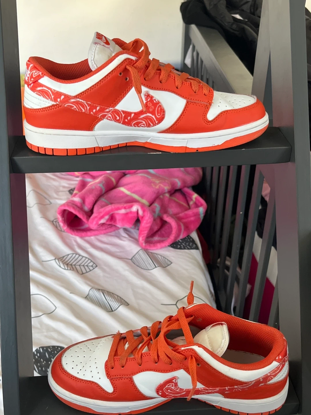 Selling a pair of Nike Dunk Low sneakers in a striking orange and white colorway. These shoes feature a distinctive paisley pattern on the iconic Nike Swoosh. They're constructed with durable leather overlays and a comfortable rubber sole for everyday wear.