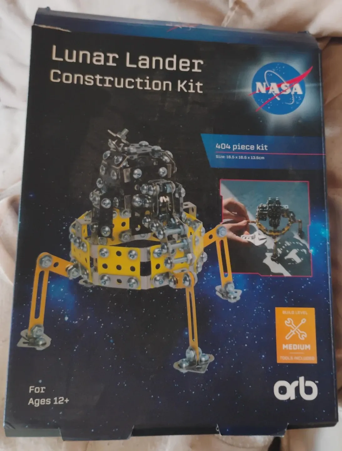 I'm selling a NASA Lunar Lander Construction Kit! It's a 404 piece kit with a medium build level. The box includes tools. It's recommended for ages 12 and up. The size of the box is 16.5 x 16.5 x 13.5cm.