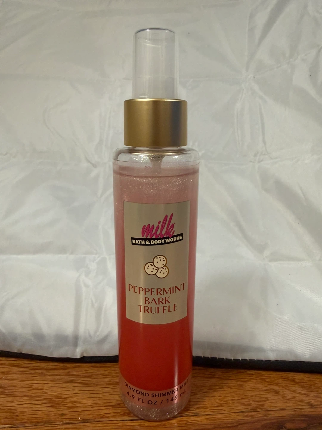 Bath & Body Works Diamond Shimmer Mist in Peppermint Bark Truffle scent. It's a 4.9 fl oz / 145 ml bottle. This mist adds a subtle shimmer and fragrance.