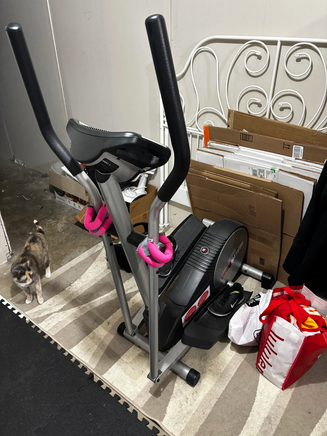 This is a HealthRider elliptical machine. It has adjustable resistance and comfortable hand grips. This machine is great for a full-body workout at home!