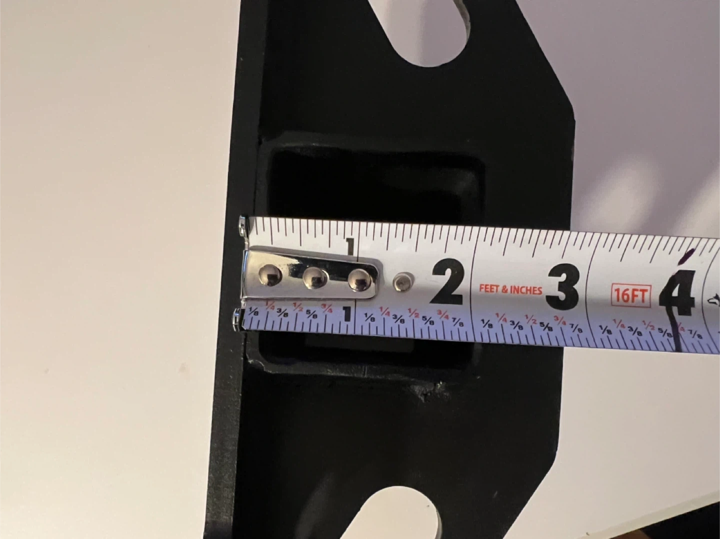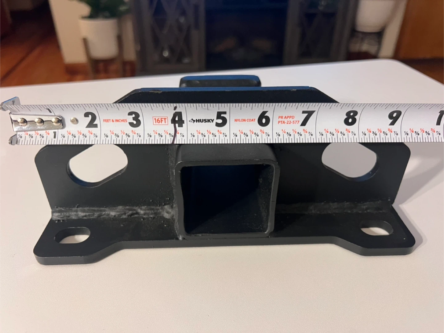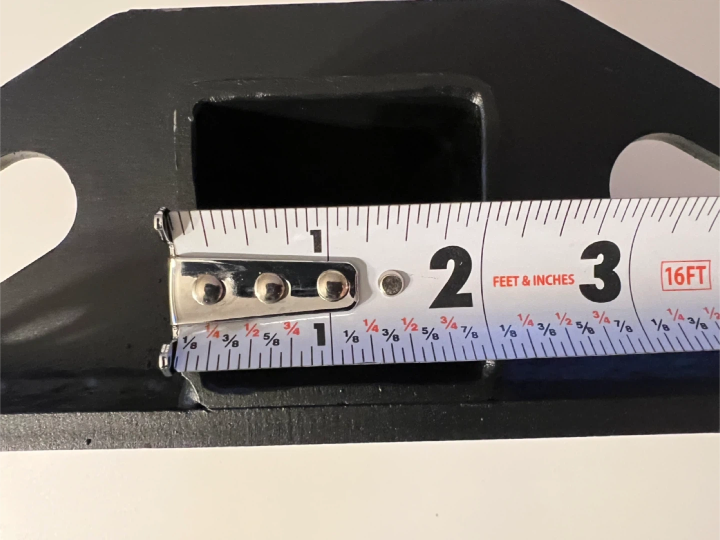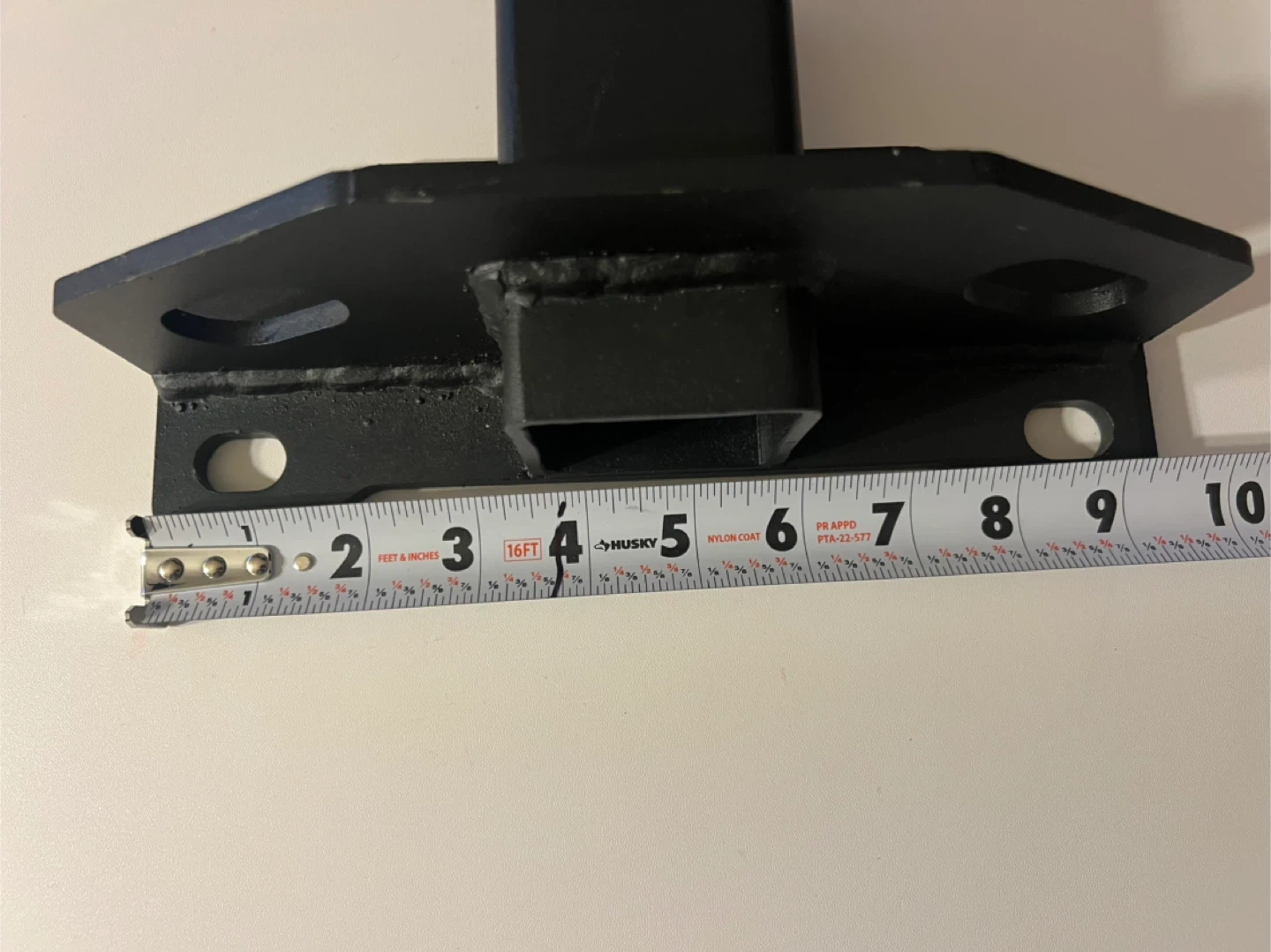 This is a black metal hitch receiver mount. It measures approximately 6 inches from the mounting plate to the end of the receiver tube. The receiver opening is about 2 inches. It features four mounting holes.
