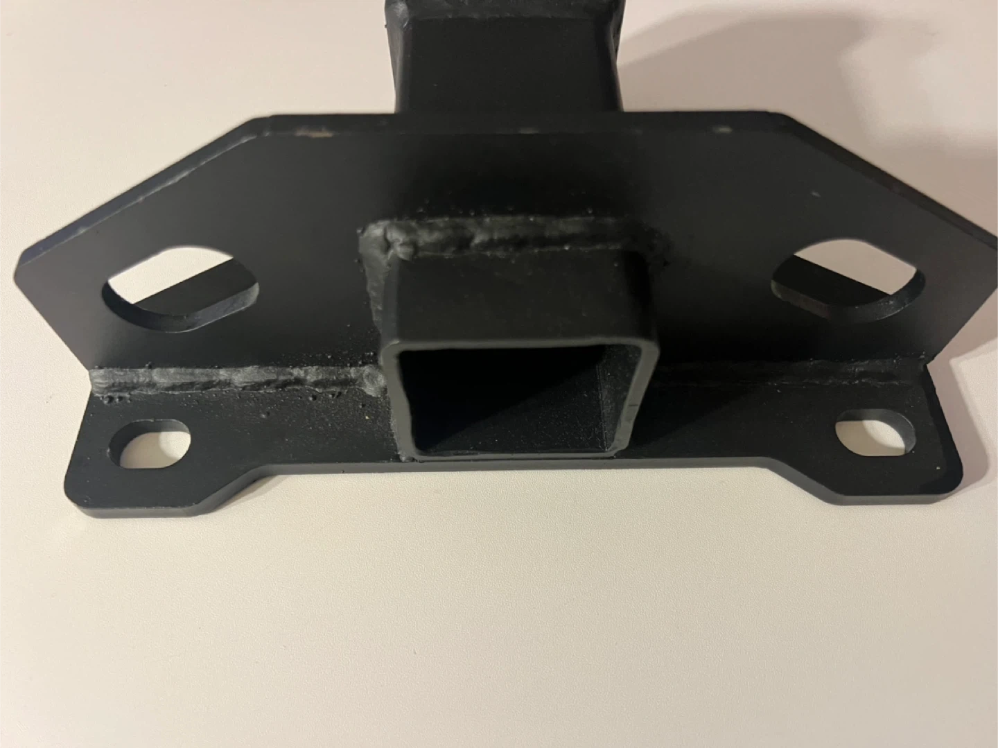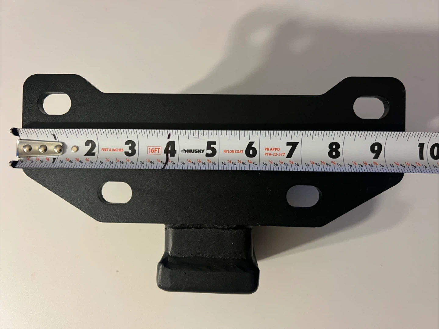 This is a black metal hitch receiver mount. It measures approximately 6 inches from the mounting plate to the end of the receiver tube. The receiver opening is about 2 inches. It features four mounting holes.