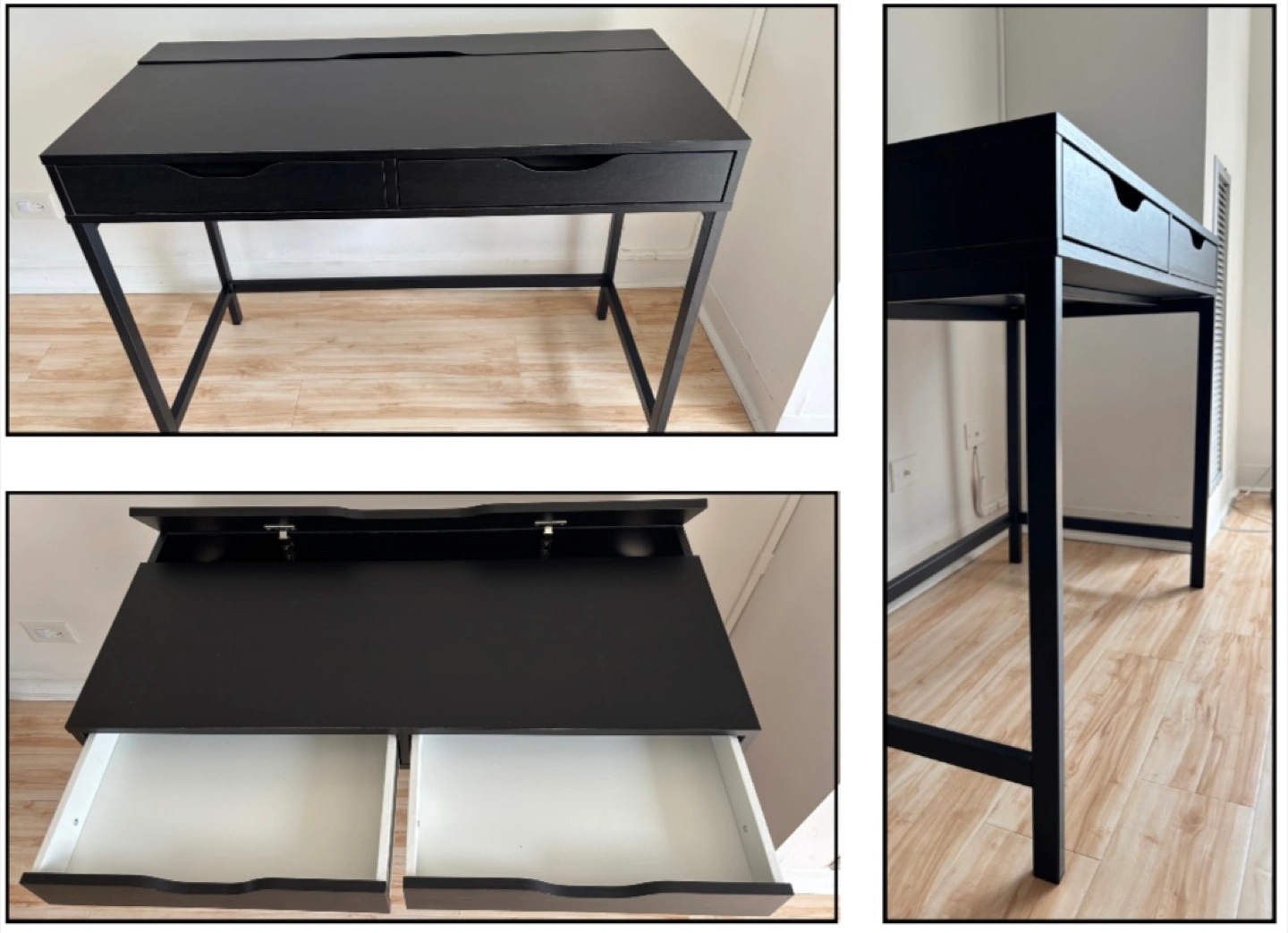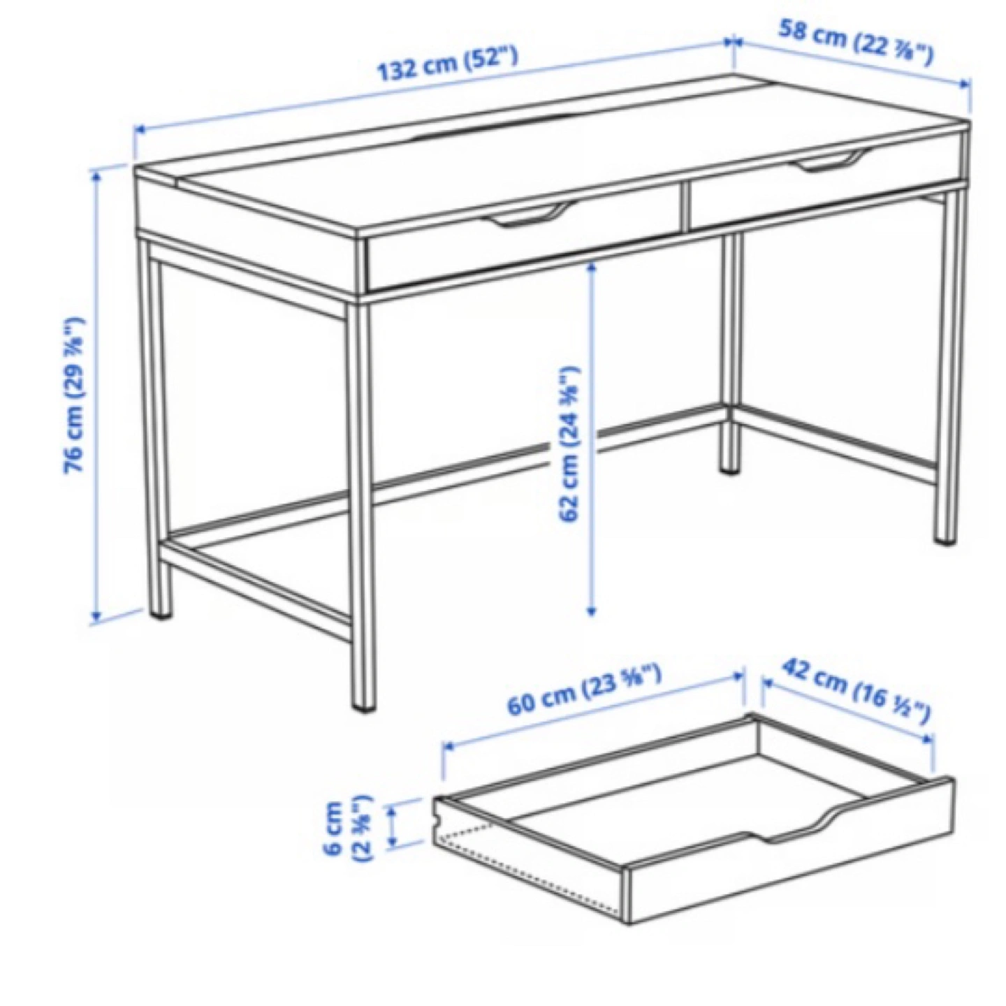 76Selling a black IKEA desk that's in great shape! It features a sleek design with two drawers for storage. The desk measures 52 inches wide, 22 7/8 inches deep, and 29 1/8 inches high. The drawers are 23 5/8 inches wide and 16 1/2 inches deep, perfect for keeping your workspace organized