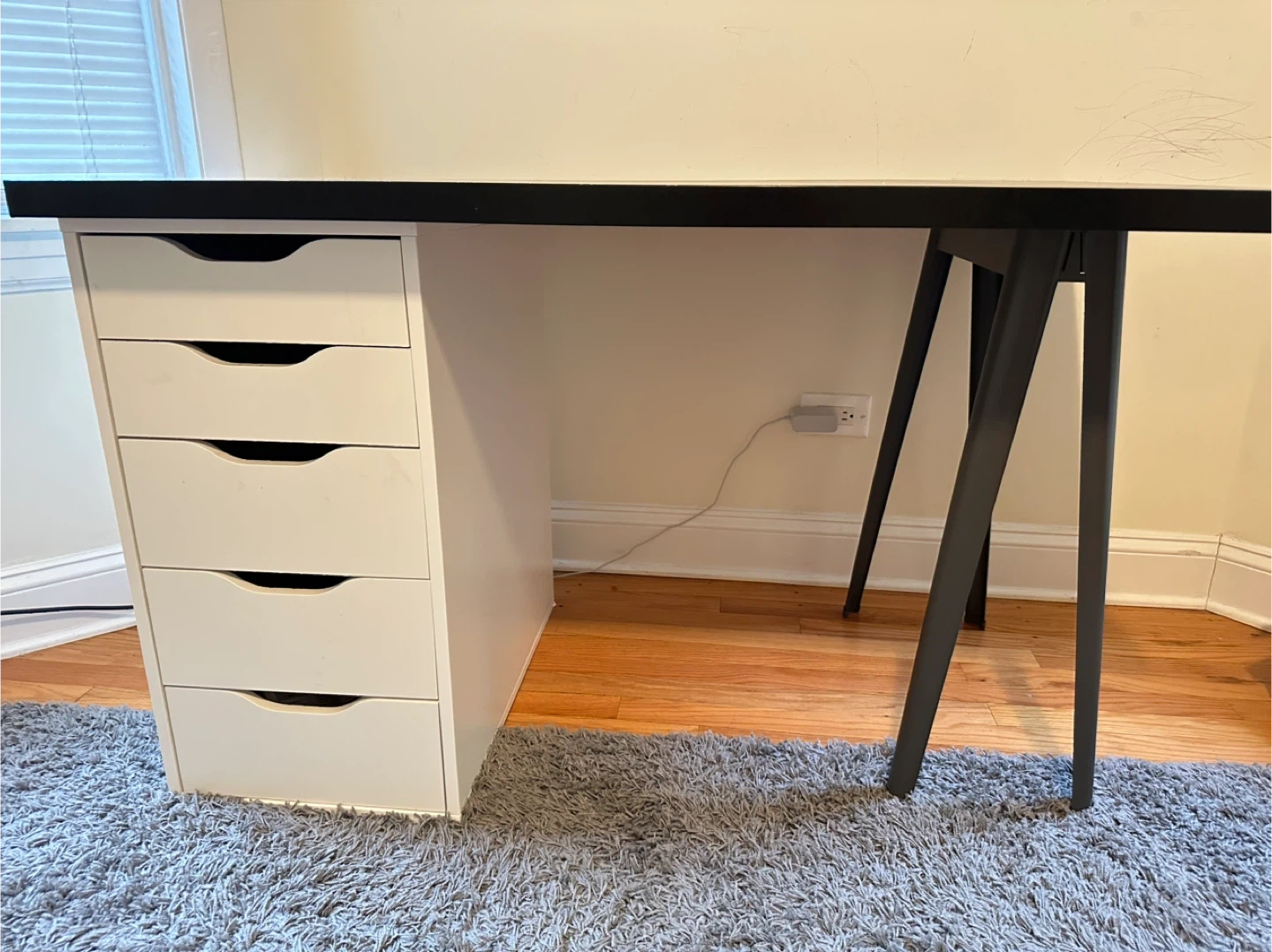 Big desk with metal frame.