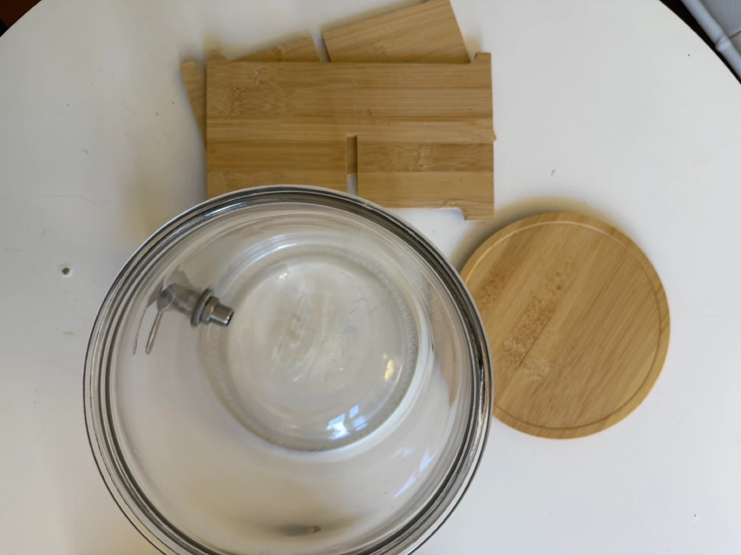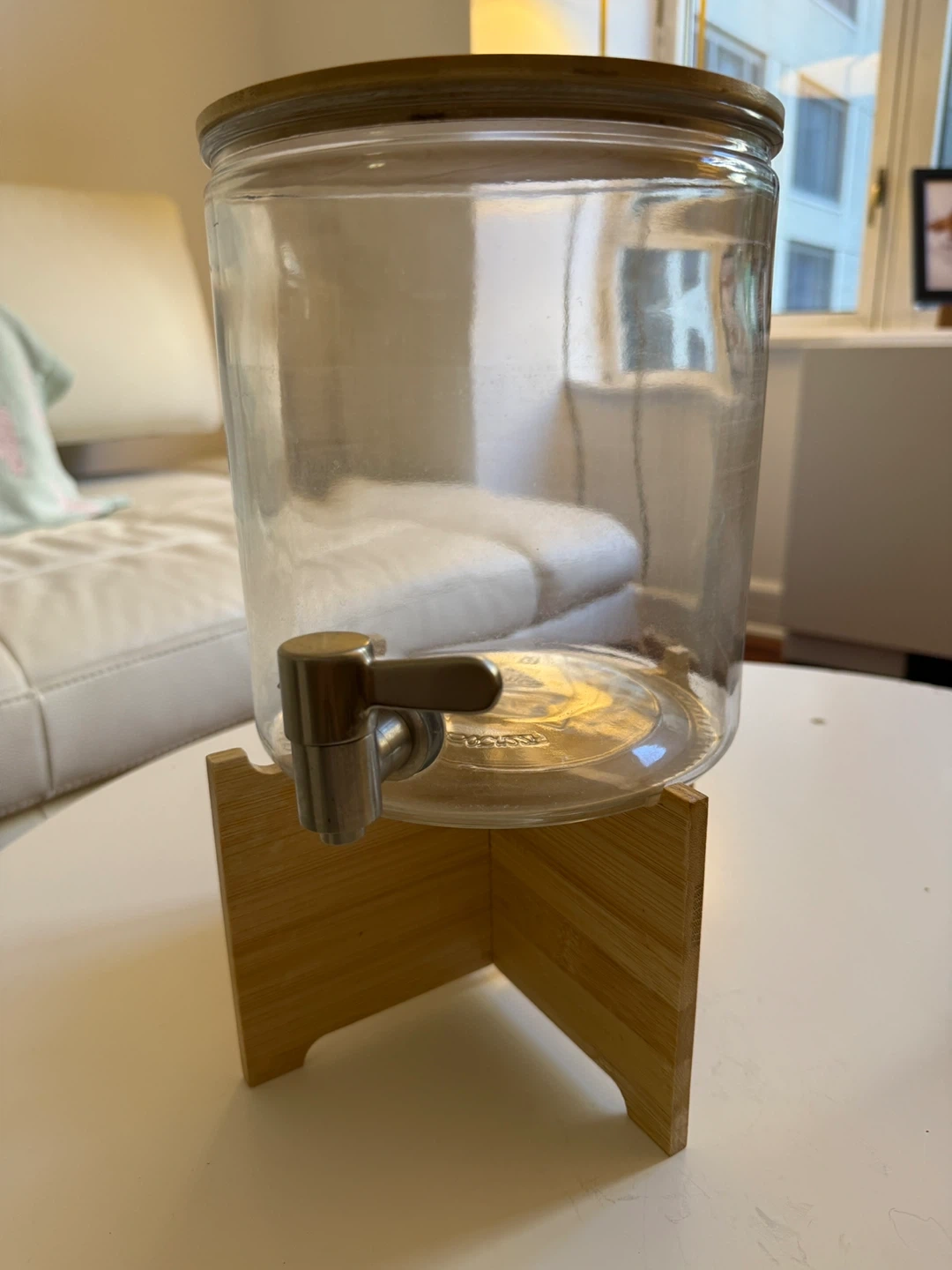 Glass beverage dispenser with tap (4 qt) Comes with a bamboo stand and lid The lid has a small crack on it (see picture for reference) Originally purchased for $30 Comes from a smoke-free home Pick up only
