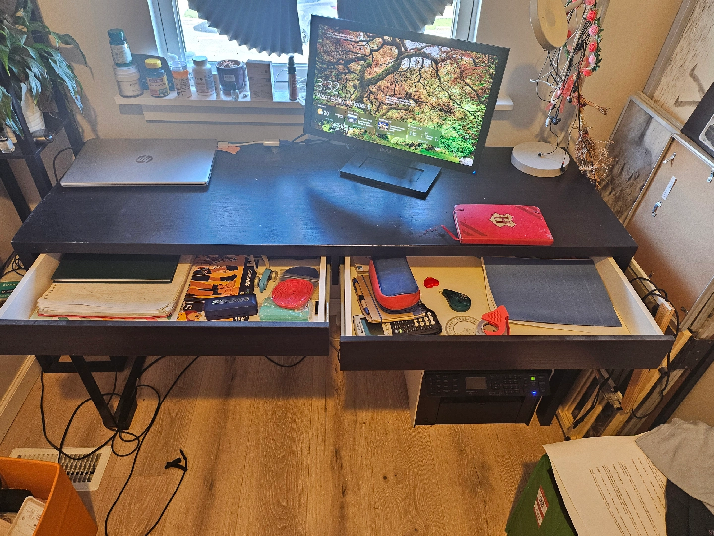 Selling a black desk that's perfect for a home office or study area. It has two drawers for storage, helping you keep your workspace organized. The desk is sturdy and in good condition, ready for a new home!