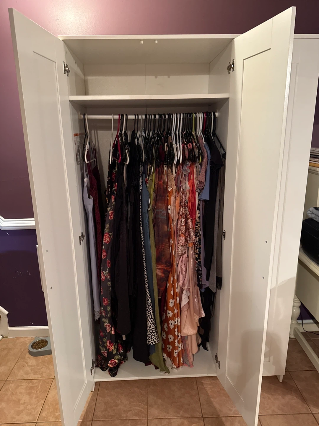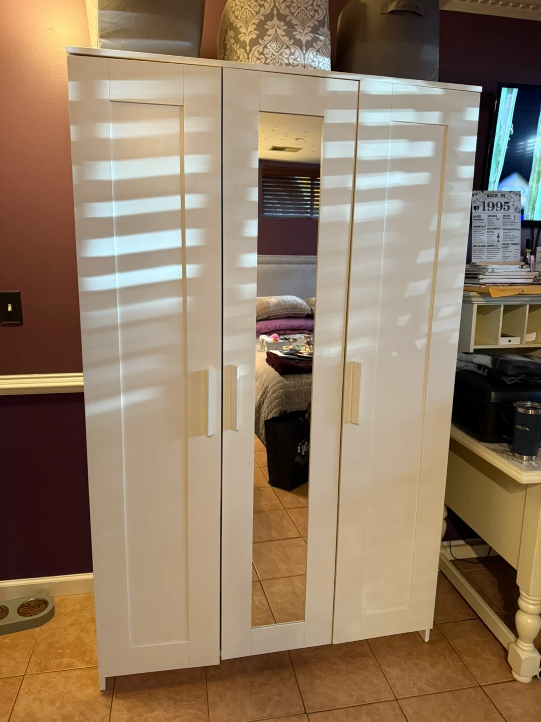 20Selling a white wardrobe with a mirror door. It has some wear and tear on the bottom, but otherwise it's in good condition. Great for extra storage!