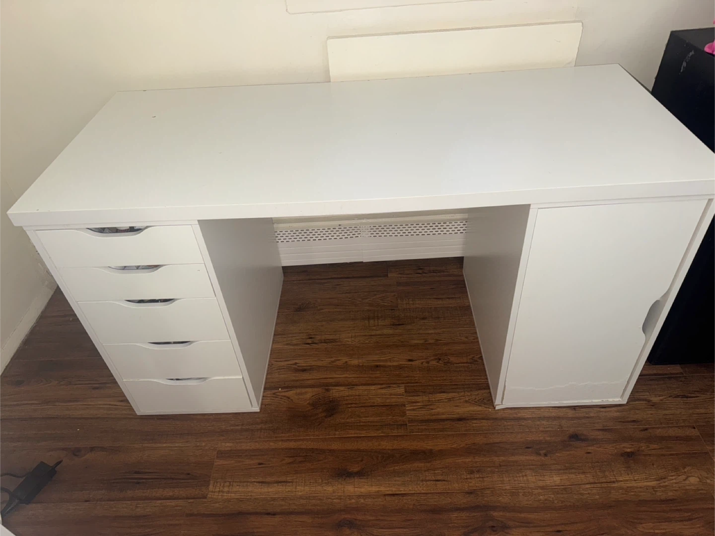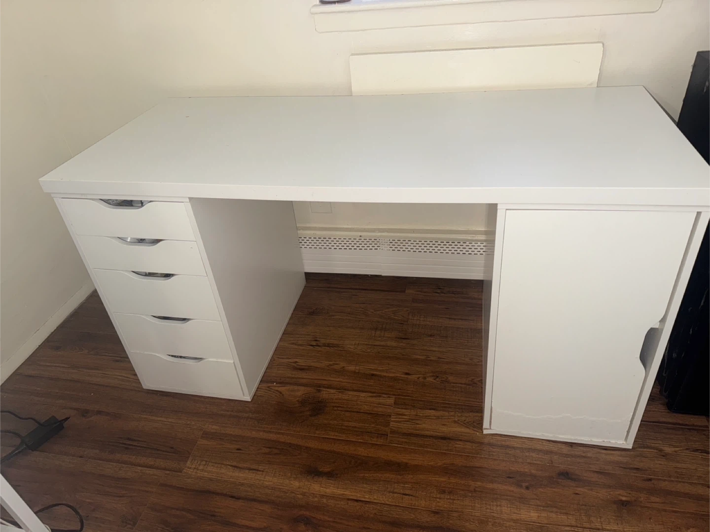 Selling a white desk with drawers. It has some minor wear and tear, as shown in the pictures. It's a sturdy desk and has plenty of storage space with the drawers and cabinet. Great for a home office or student!
