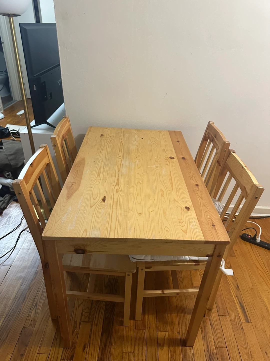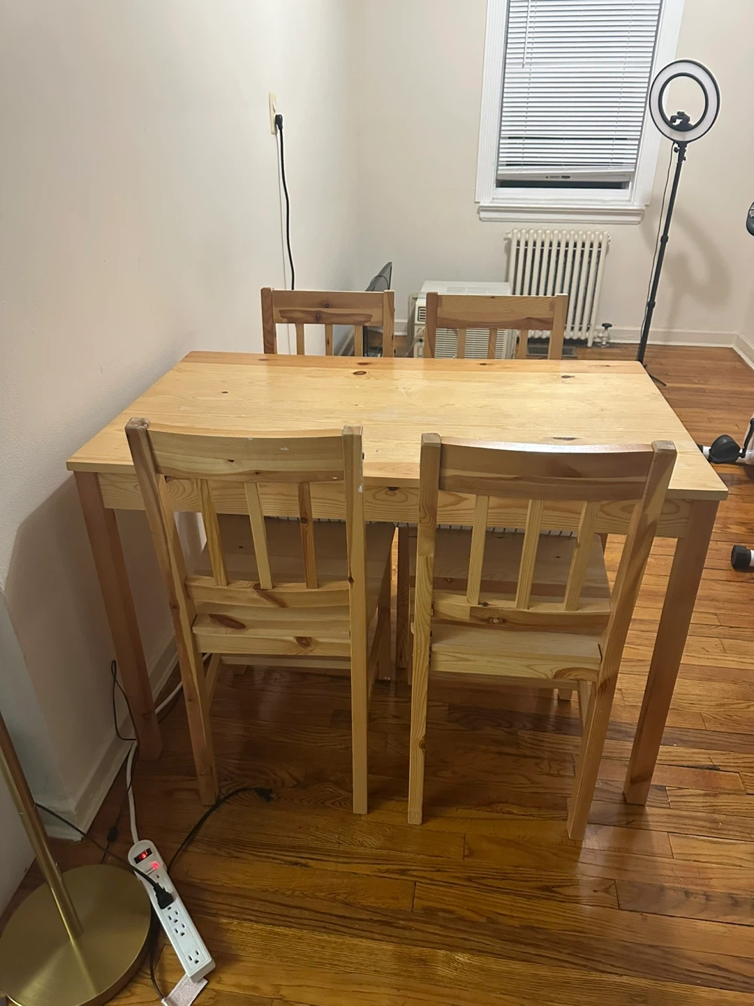Selling a wooden dining table from IKEA, complete with four matching chairs. It's in good condition and ready to be the centerpiece of your dining area. Perfect for small spaces or cozy meals!