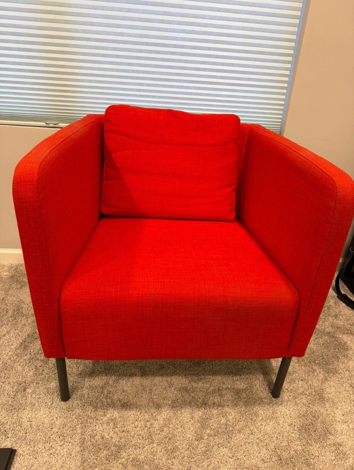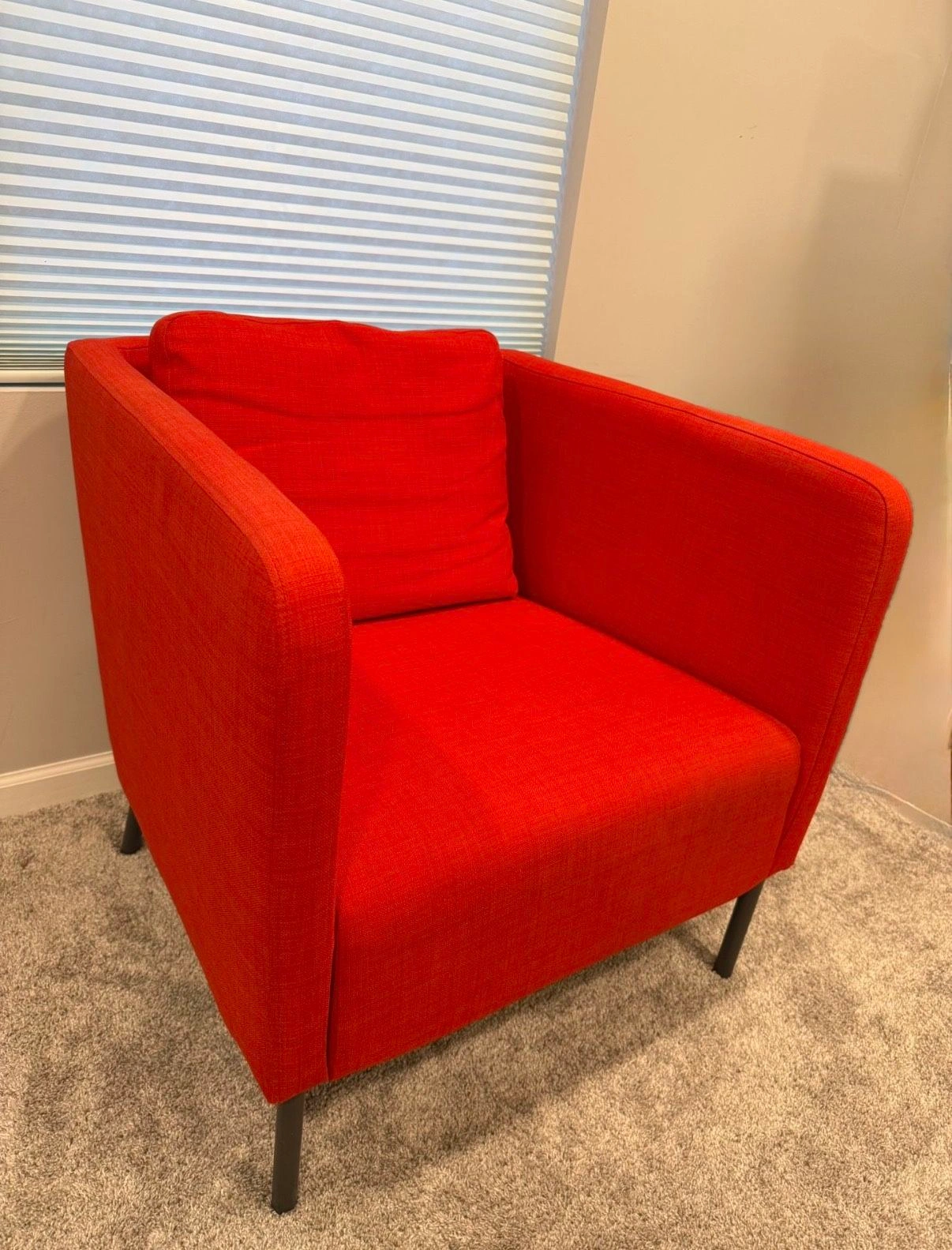 15Stylish IKEA EKERÖ armchair in Skiftebo Orange — originally $279, now only for $50! Comfortable, sturdy, and stylish with a removable cushion cover. Gently used, clean, and in great condition from a non-smoking, pet-free home. Adds a bold pop of color to any living space or office. 📏 Dimensions: 27.5″ W × 28.75″ D × 29.5″ H 📍 Northbrook / Glenview 💵 Cash / Venmo / Zelle 🚚 Pickup only — easy to fit in a SUV.