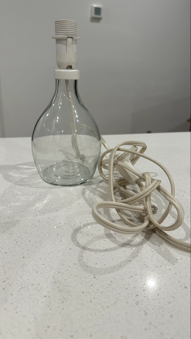 119Clear glass bottle lamp with a white electrical cord and plug. Simple design. Perfect for a bedside table or small space. Works perfectly fine.