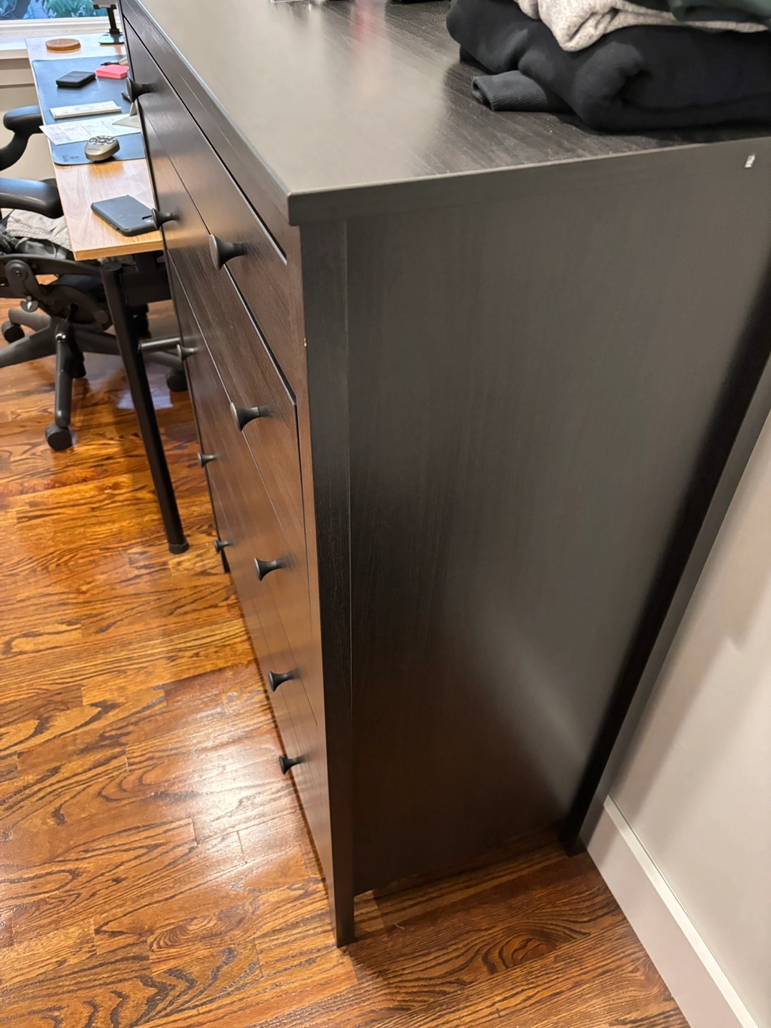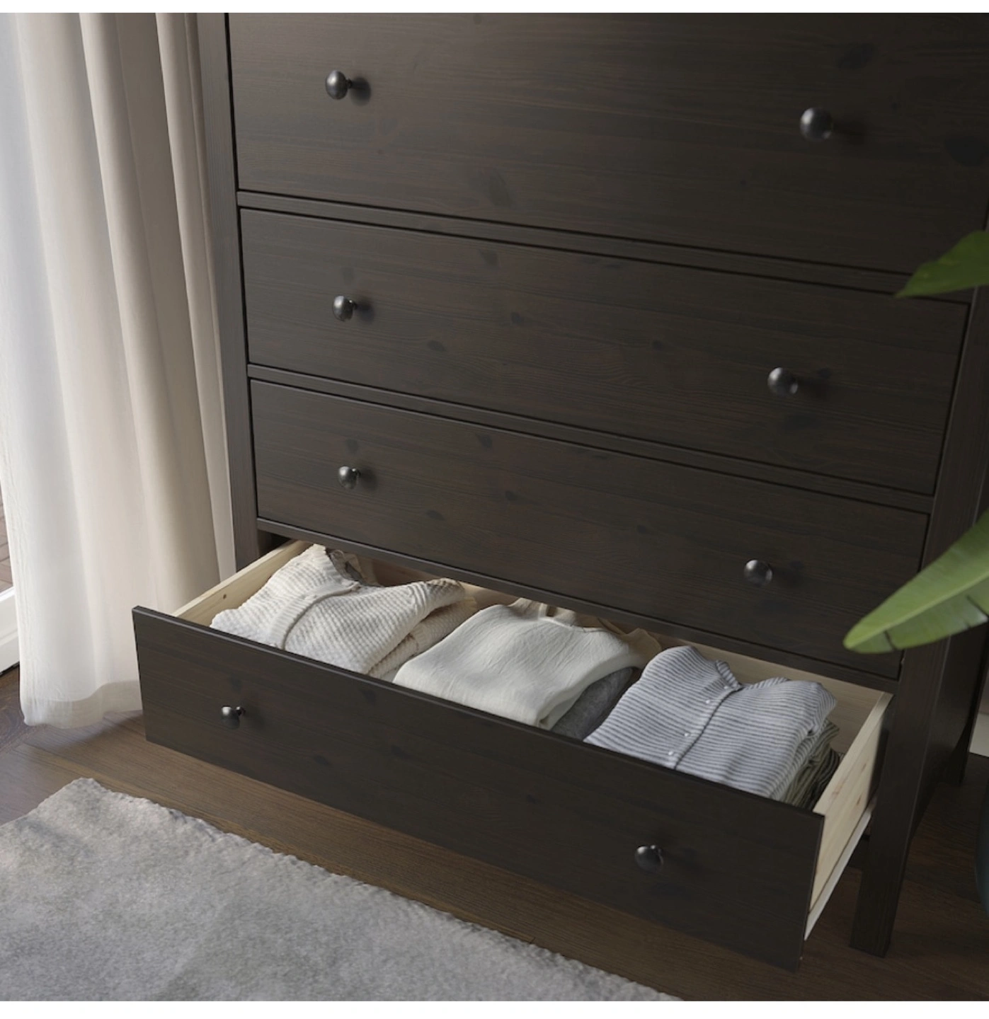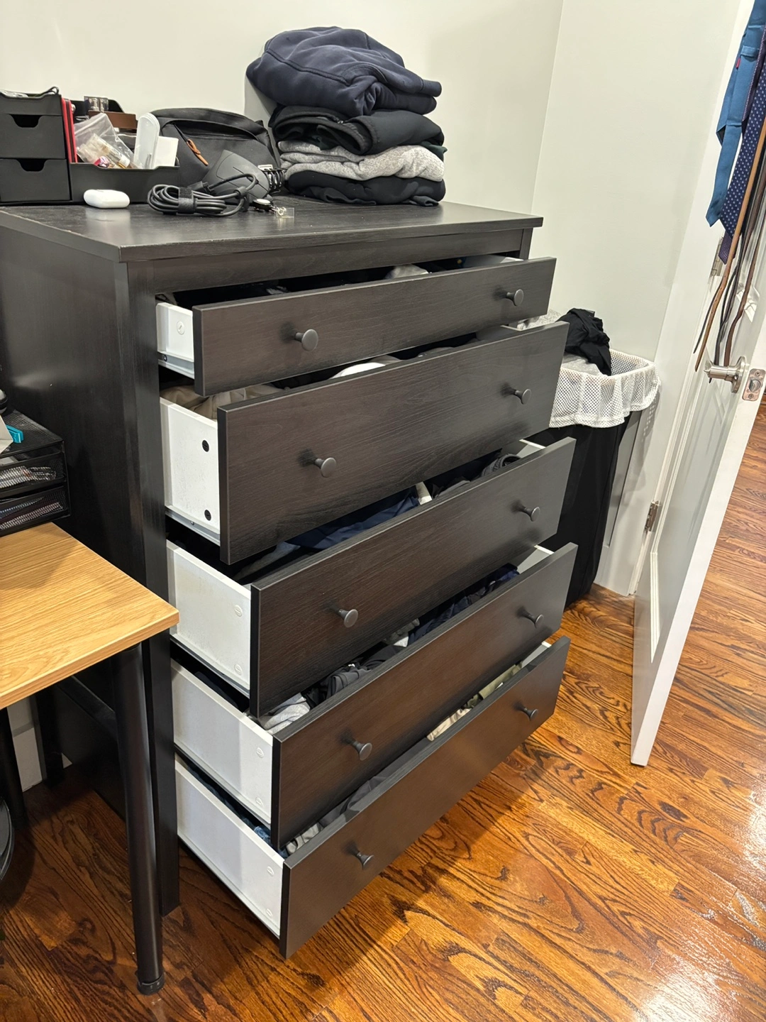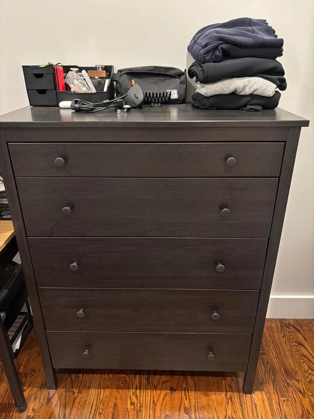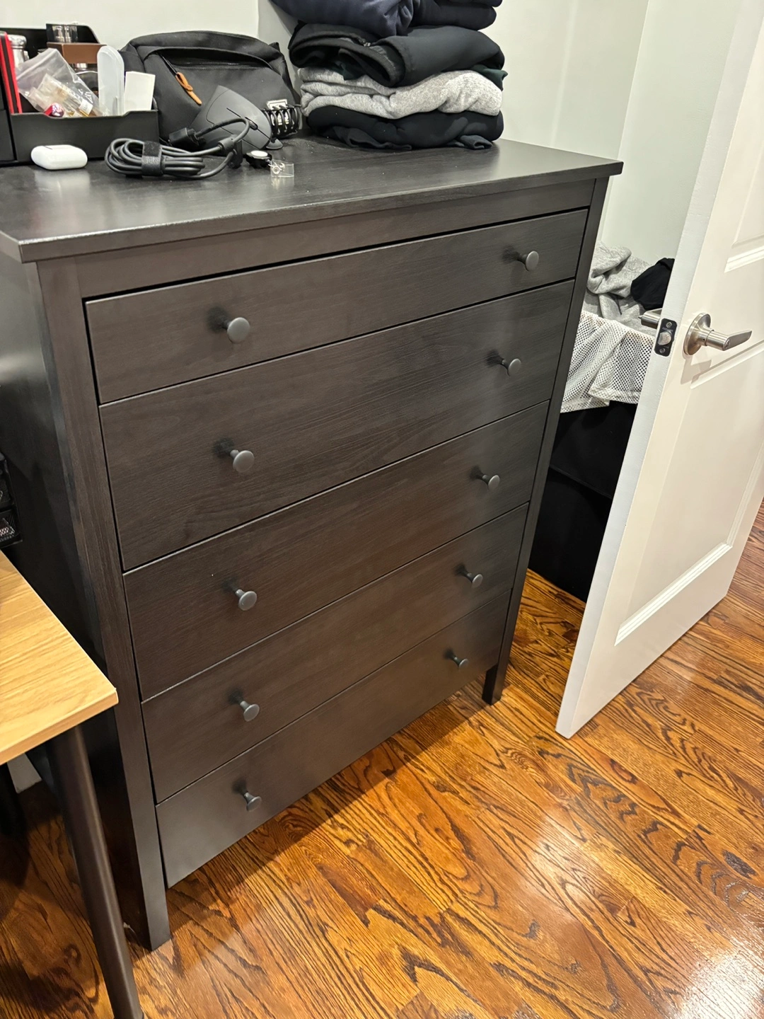 A dark-brown chest. Features five drawers with knobs. Its simple design can create a comfortable space for storing all your belongings. In great condition Pick up only in Astoria 11103 Cash only