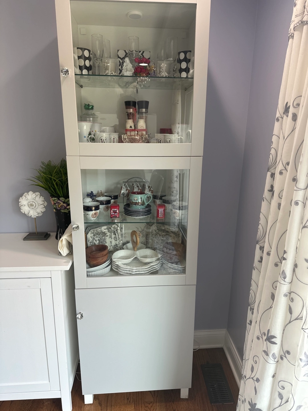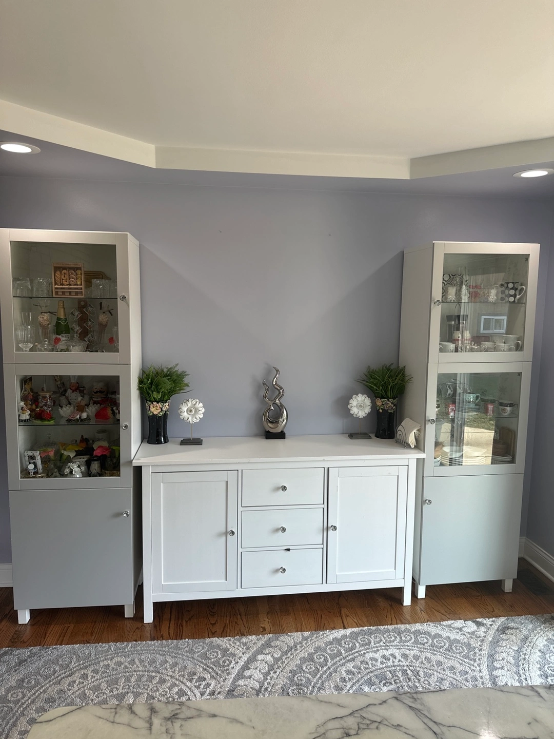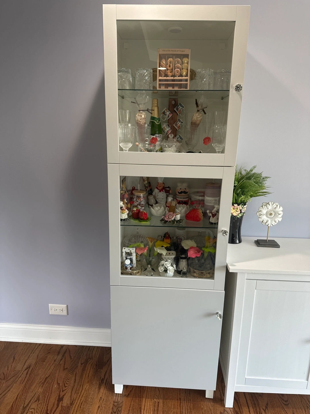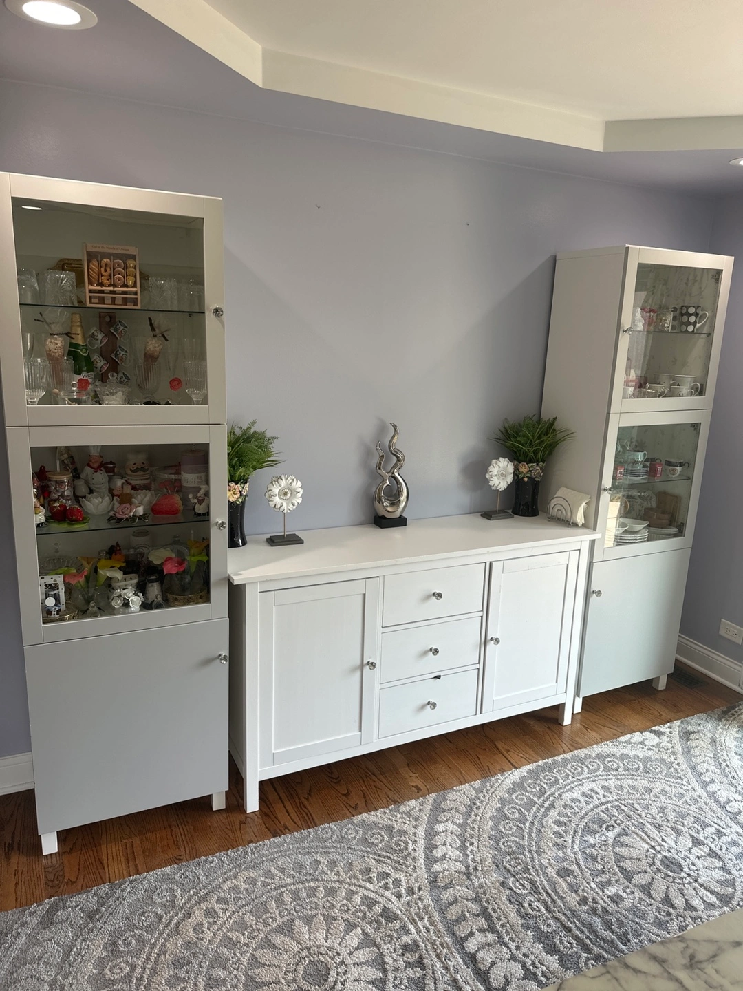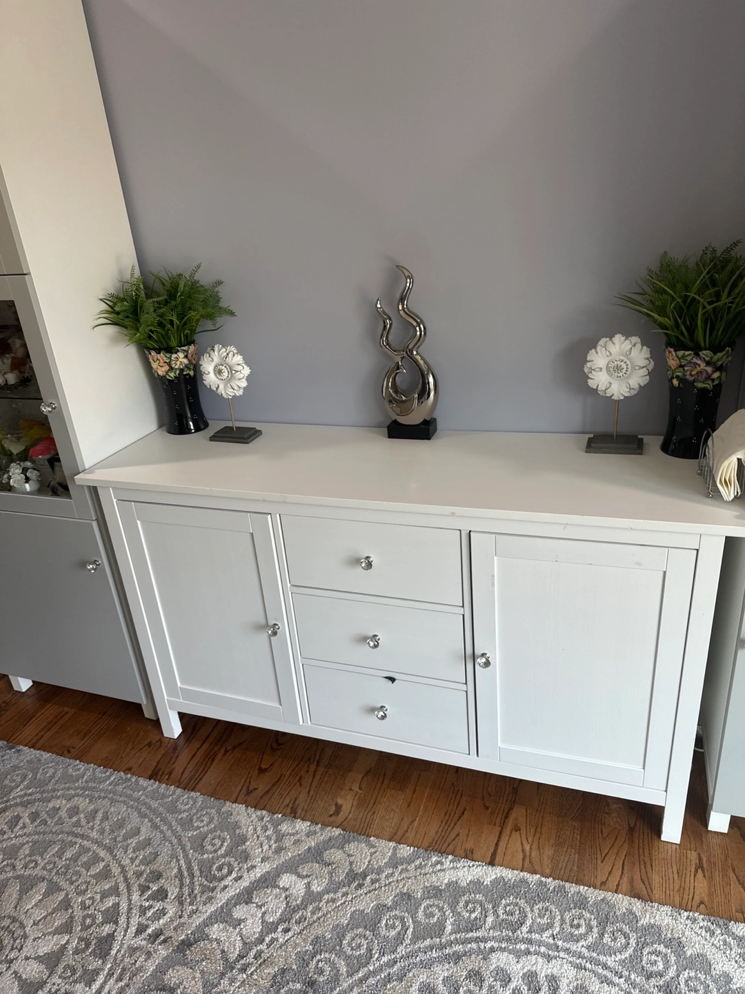 Selling a lovely IKEA Hemnes glass door cabinet and buffet. It's a great set for displaying your favorite items and providing extra storage. The cabinets have glass doors to showcase your items, while the buffet offers drawers and cabinets for concealed storage. The set is in great condition and ready to find a new home!