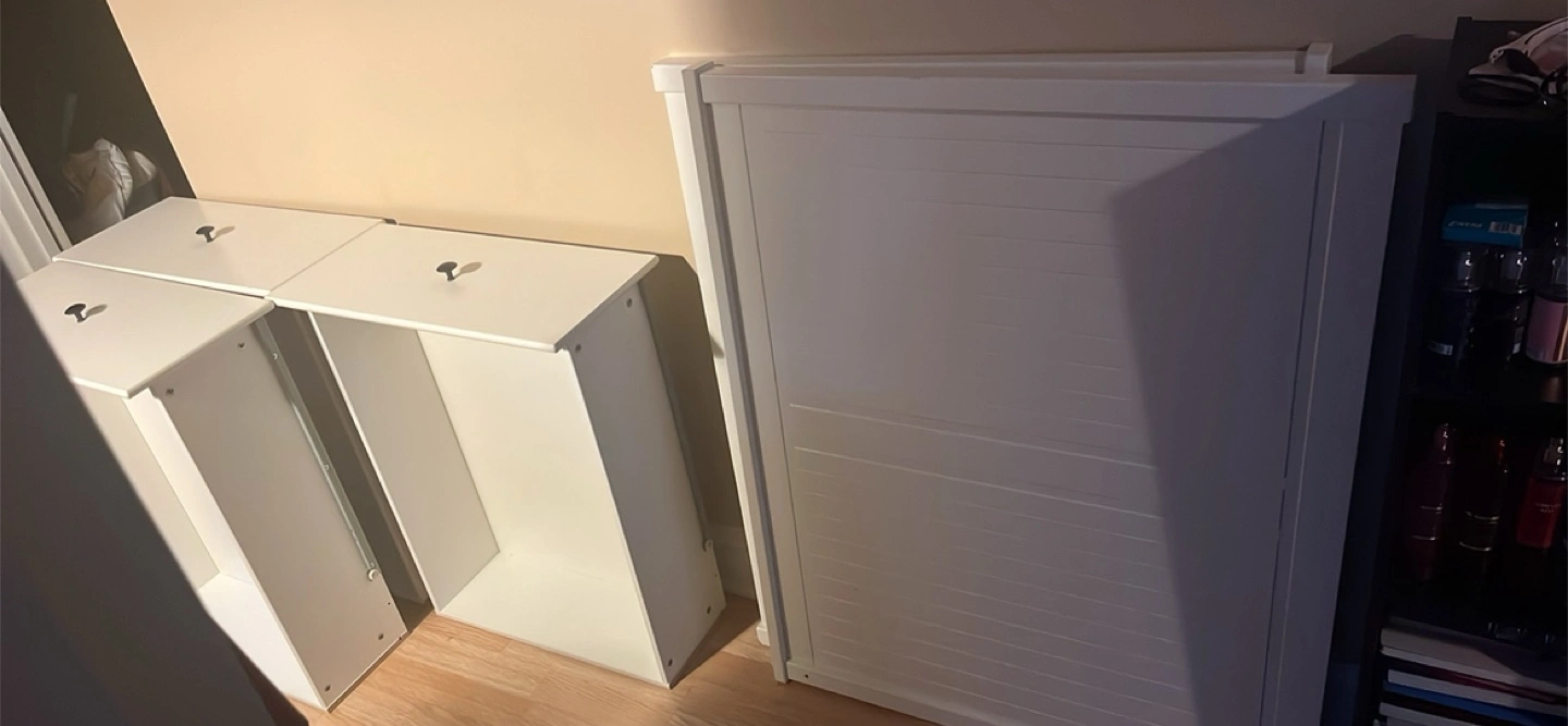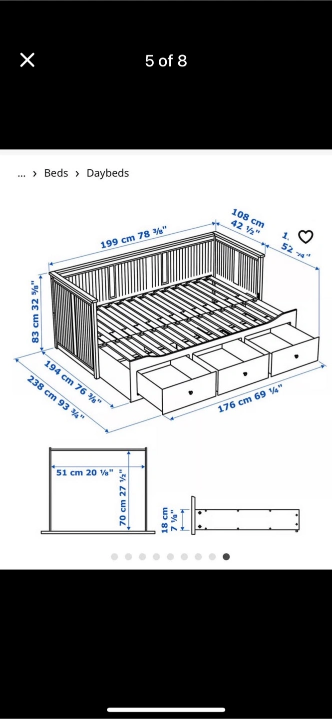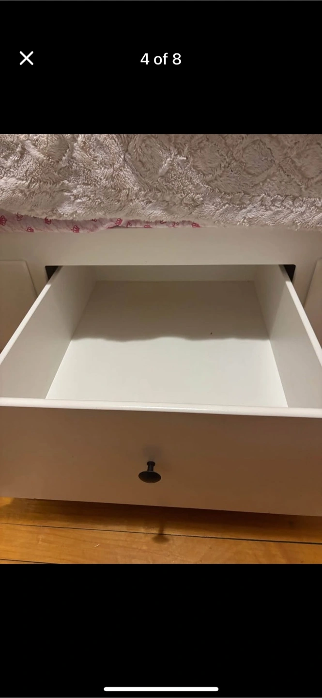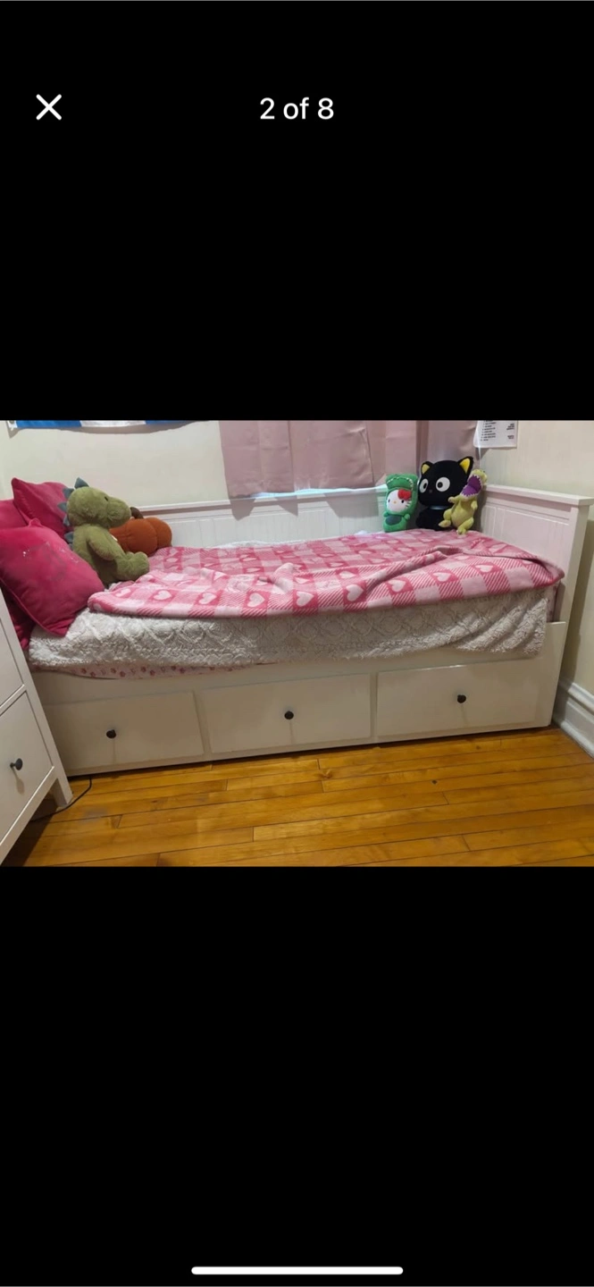 Twin daybed with pull out to convert has 3drawers. Great condition. We had led lights around the top of bed and when we took off there are some scrapes along the top of the frame. Will need to paint with touch up or add lights again. Bed is partially taken apart