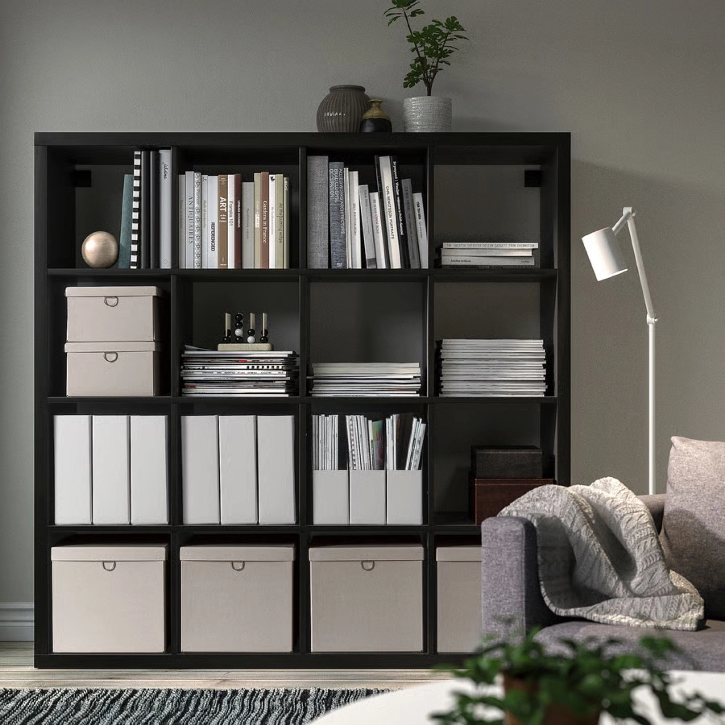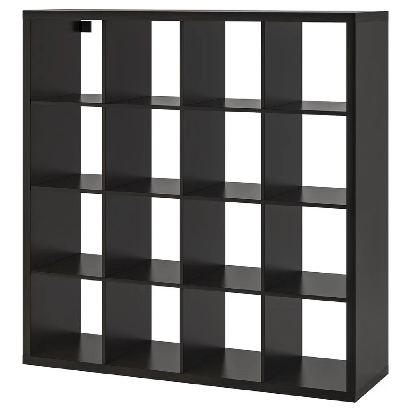 Selling an IKEA Kallax shelf unit in espresso color. It's perfect for organizing books, toys, or displaying your favorite items. Dimensions: - Width: 57 7/8 " (147 cm) - Depth: 15 3/8 " (39 cm) - Height: 57 1/2 " (146.5 cm)