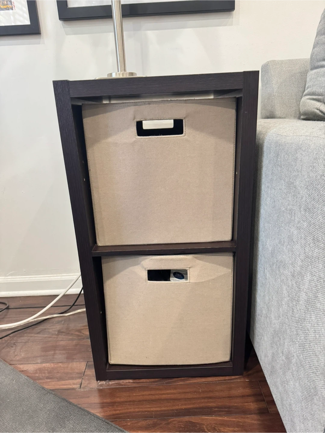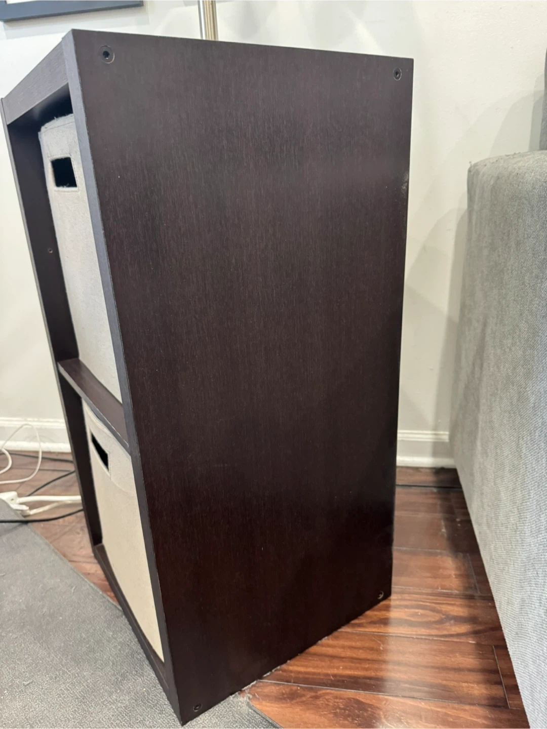 Selling an IKEA Kallax shelf unit in great condition! It comes with two inserts, perfect for organizing your space. The dark brown color fits well with most decor. It's sturdy and ready for a new home!