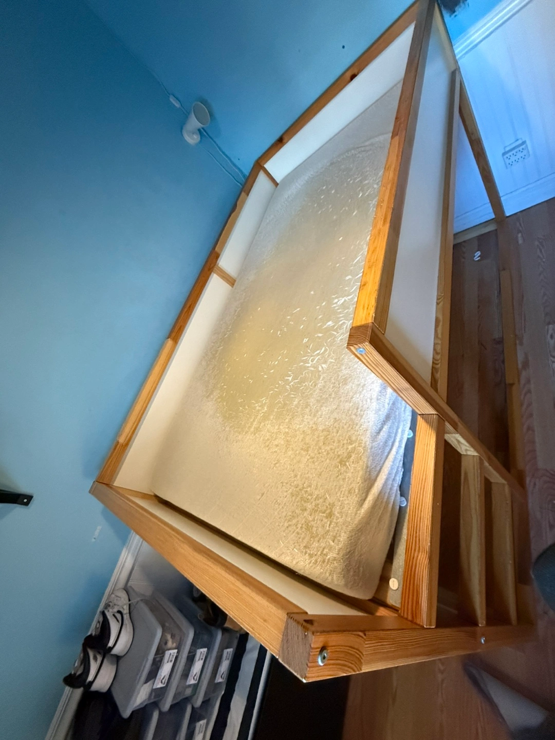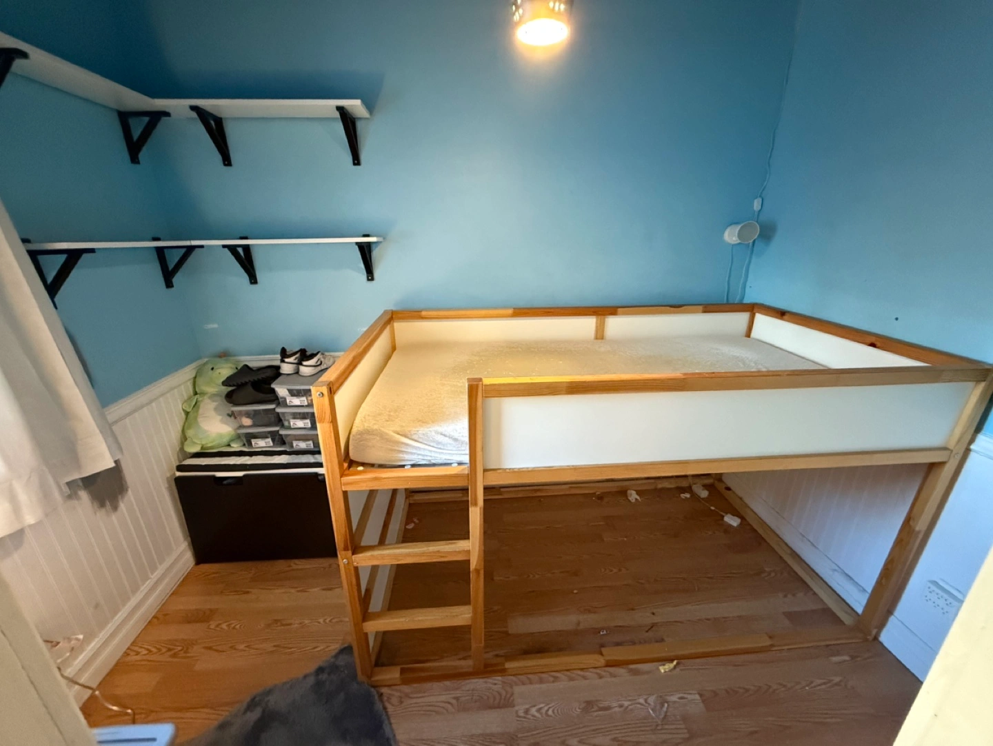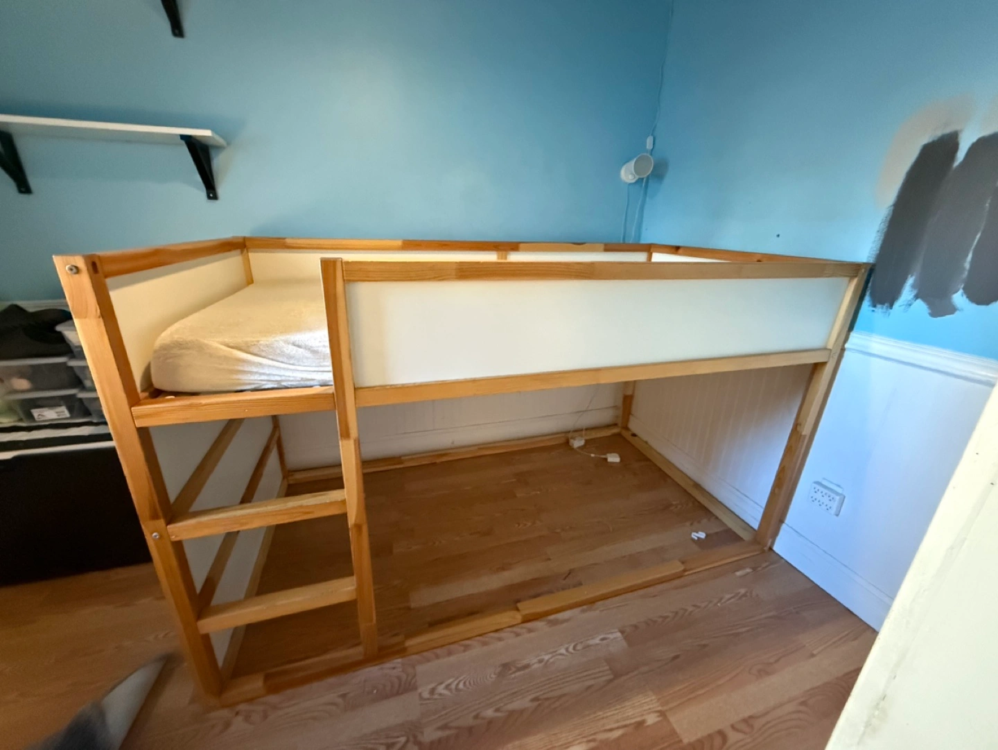 78Must be picked up asap. Can only hold til next week: Used IKEA Kura bed frame. White and pine. Some assembly required. Good condition. Missing one slat that broke in half, still have it, can be replaced or repaired, still secure. Bed can be used as a half loft or upside down as a regular frame. Also have the blue bed tent pictured that can be included. Some markings in the wood from use over time by small children .. shown in photo.