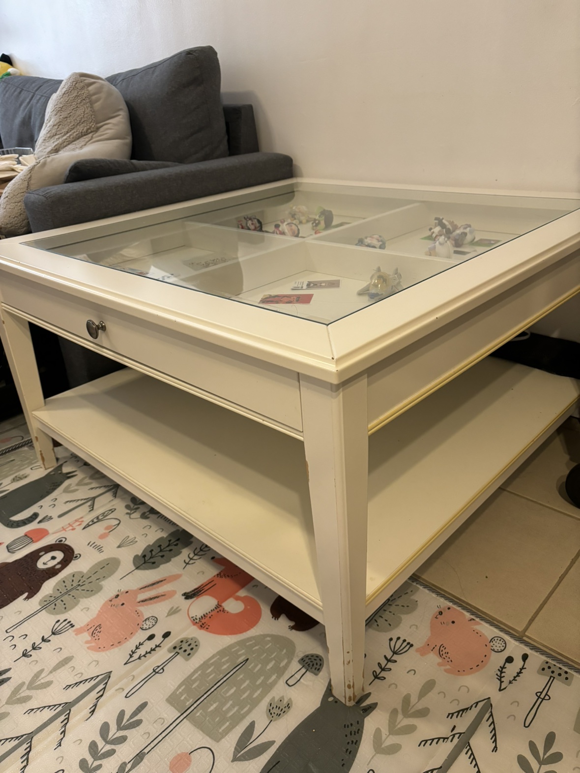 15Ikea LIATORP Coffee Table-$200 Product dimensions Length: 36 5/8 " Width: 36 5/8 " Height: 20 1/8 " Key features Practical storage space underneath the table top. Separate shelf for storage/display and the table top is glass.