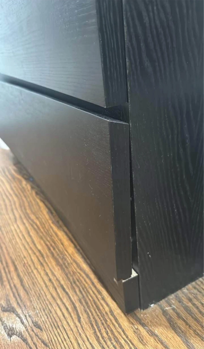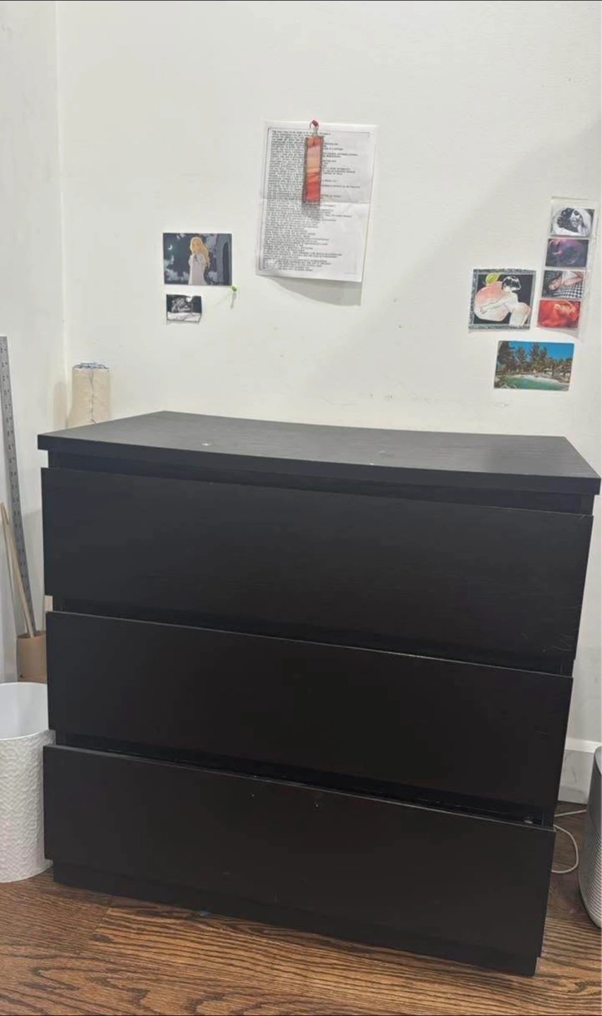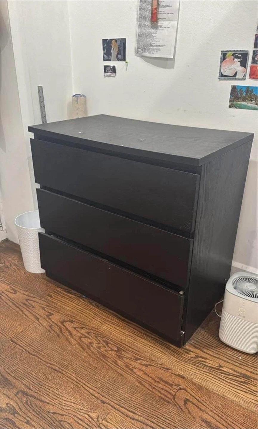 20Selling a black IKEA Malm dresser with three drawers. It's a great storage solution for any room! The dresser is in used condition with some signs of wear. The bottom drawer shuts weird.