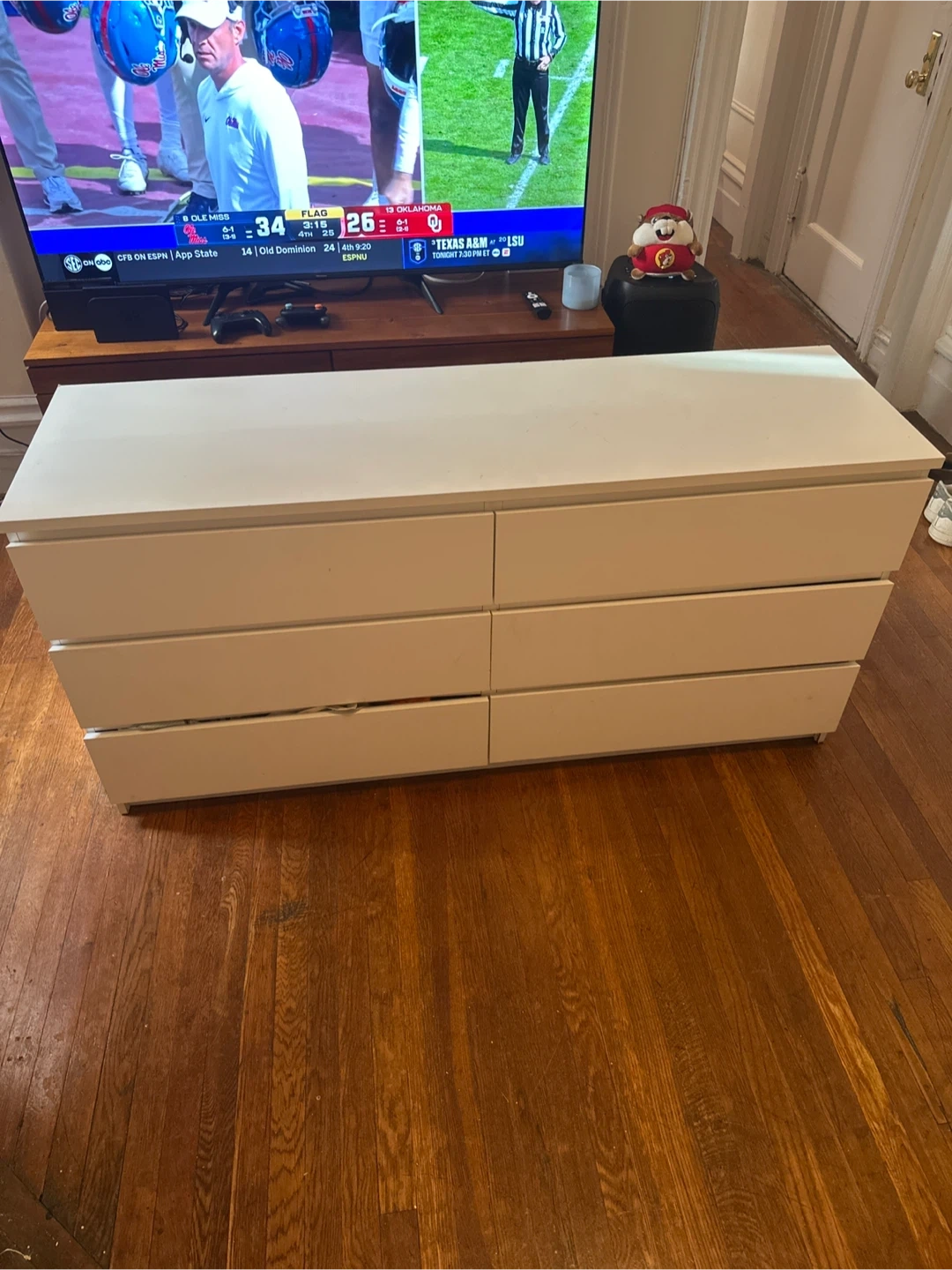 9Dimensions: 63 inches long x 19 inches wide Selling a white IKEA Malm dresser with 6 drawers. It's in good condition and offers plenty of storage space. Perfect for organizing your clothes and keeping your room tidy. It's a great piece of furniture!