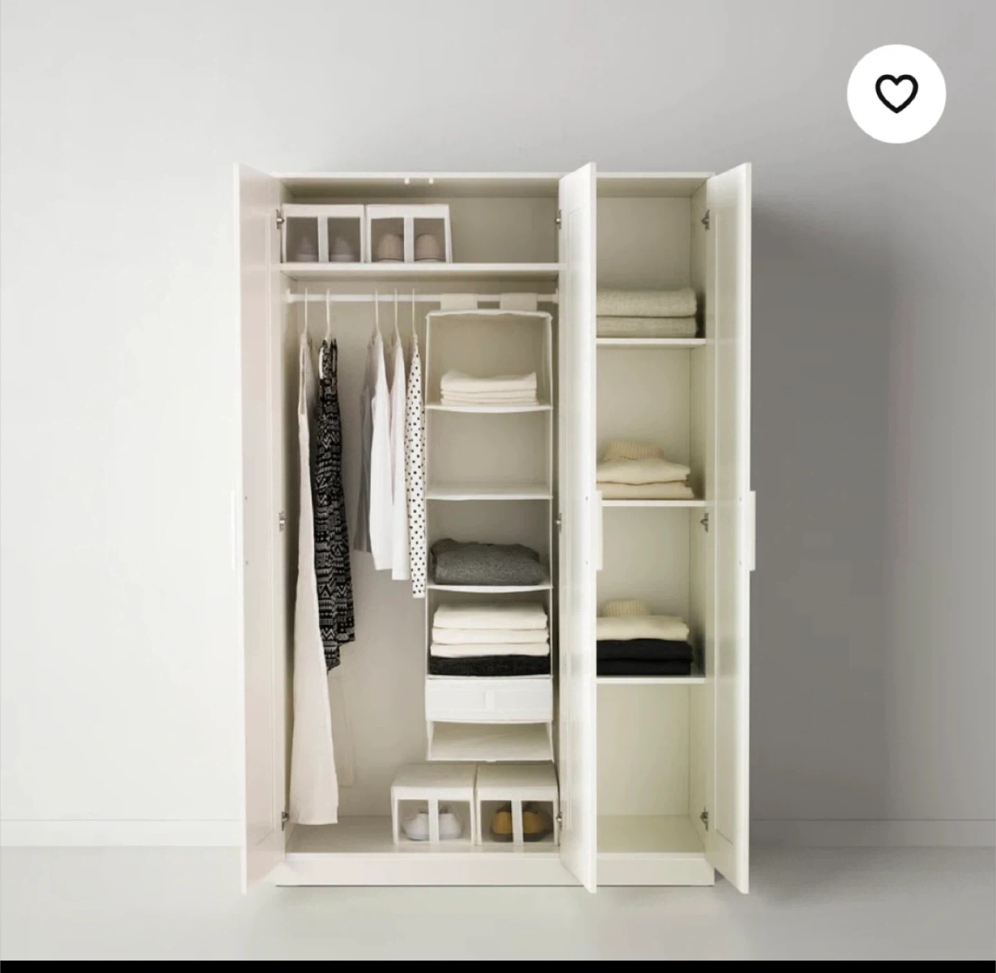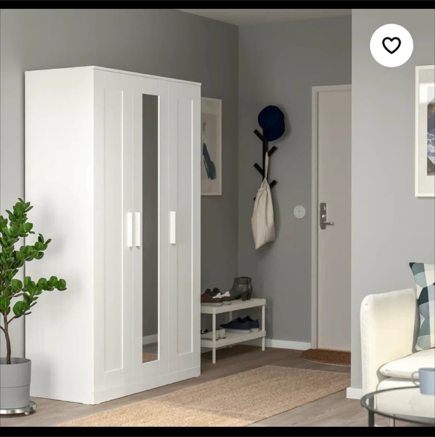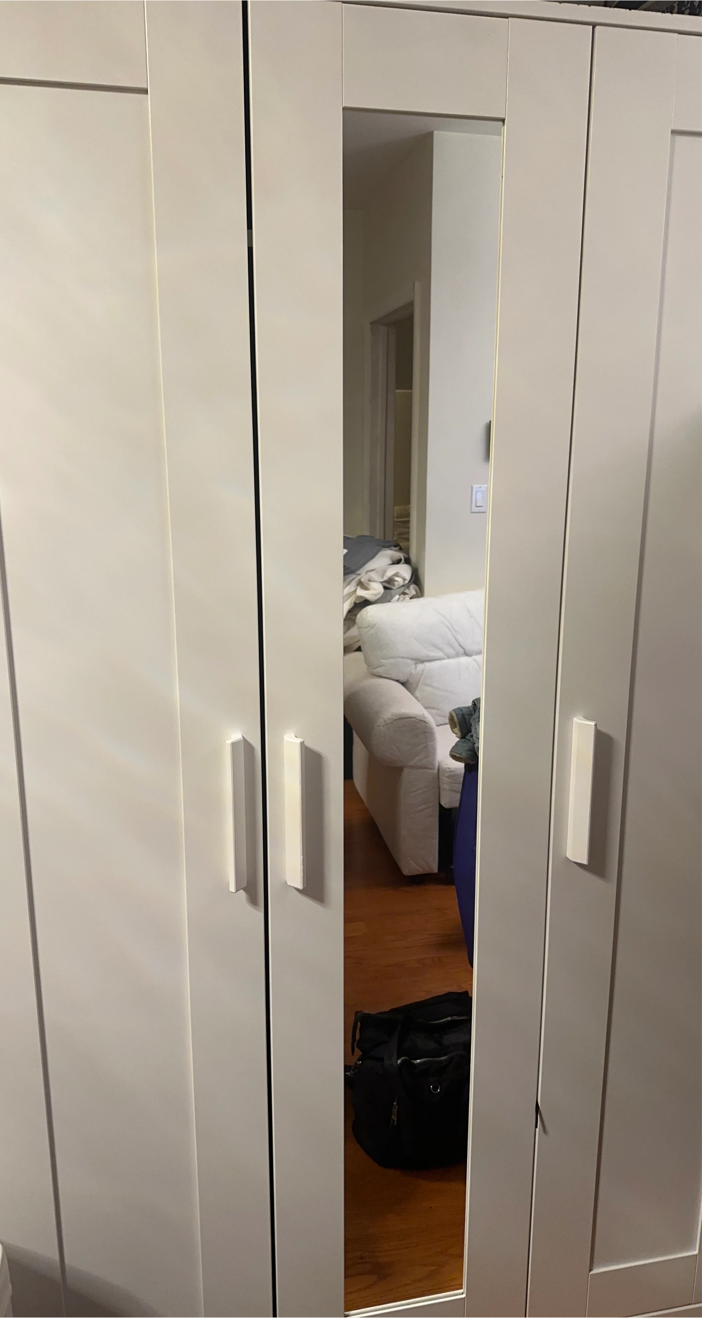 Selling an IKEA PAX wardrobe with mirror doors! It's in great condition and ready to help organize your space. The wardrobe features a clean, white finish and includes interior shelving and a hanging rod. Dimensions are approximately 46 inches wide, 23 inches deep, and 74 3/4 inches high.