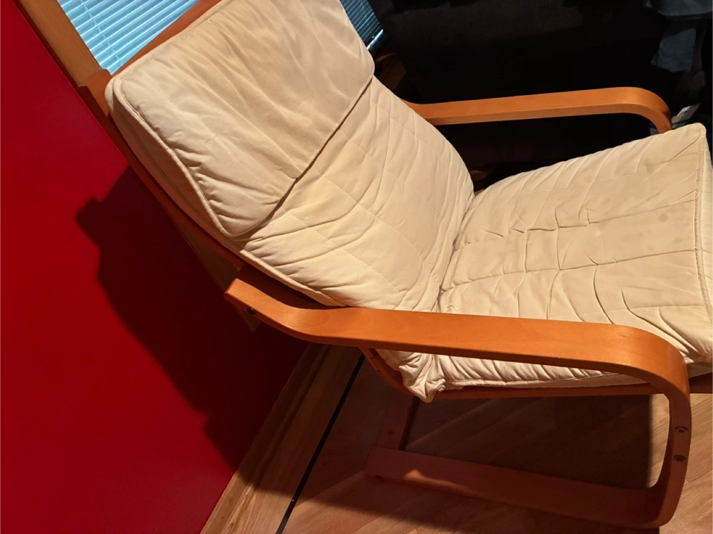 19Selling a comfortable IKEA Poang chair! It's perfect for relaxing and adding a touch of style to any room. The chair features a sturdy wooden frame and a soft, beige cushion. It's in you good condition and ready for a new home