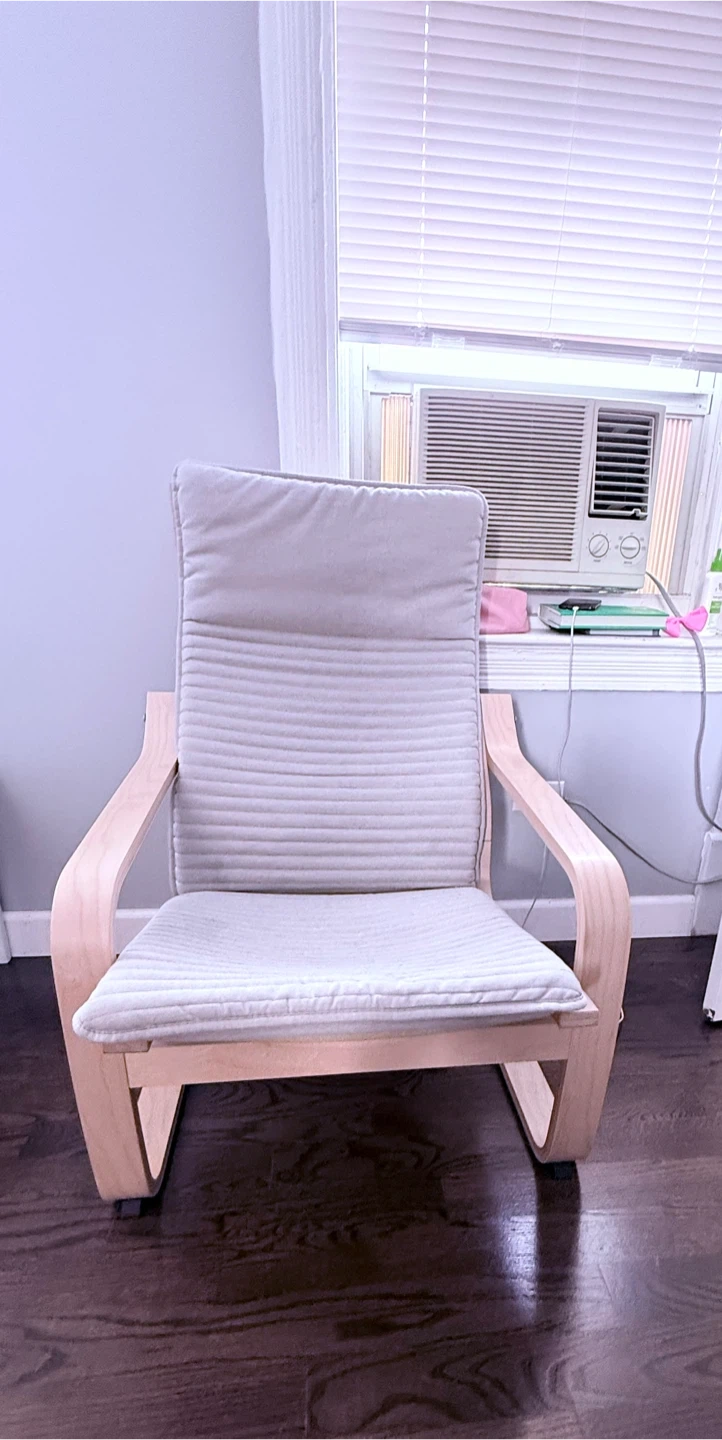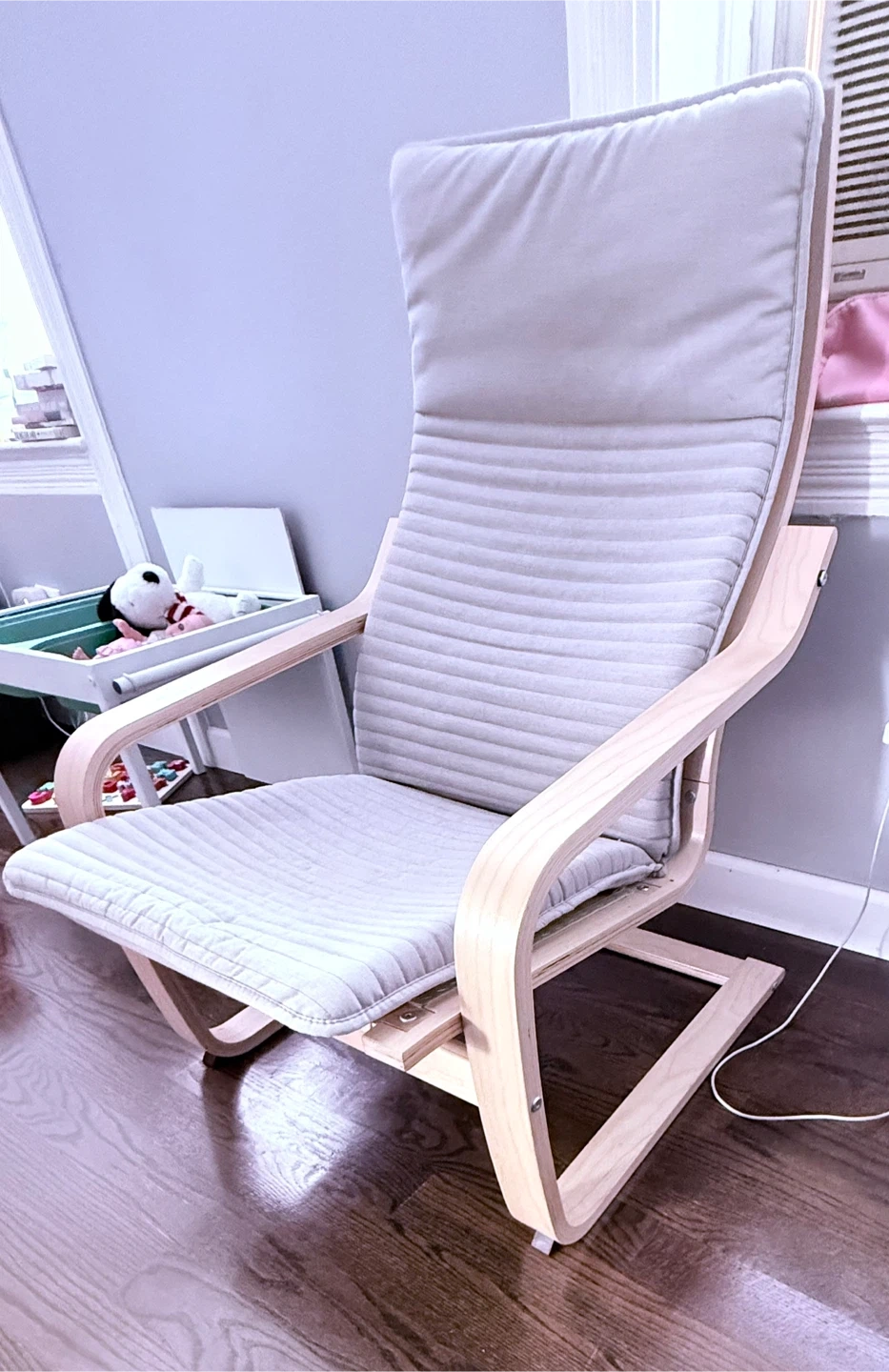 Selling an IKEA Poang chair in birch veneer with Alme natural cushions. It's super comfy and in great condition! The frame is made of bent birch, which gives it a nice bounce. Perfect for relaxing after a long day