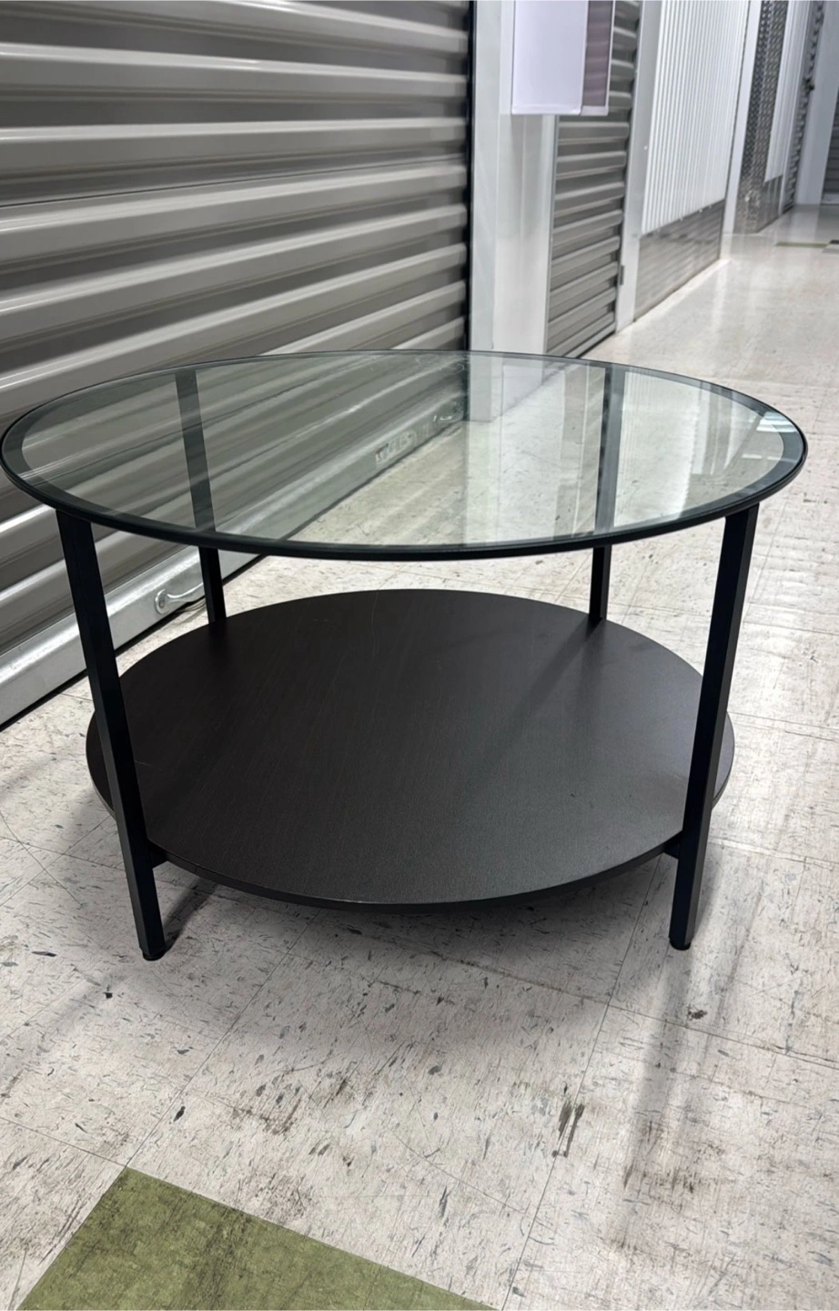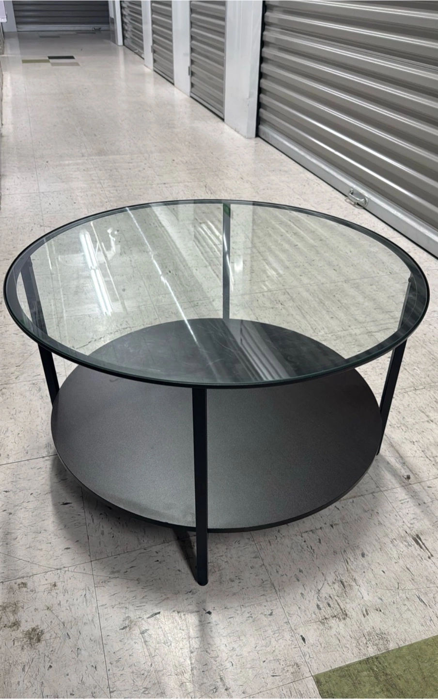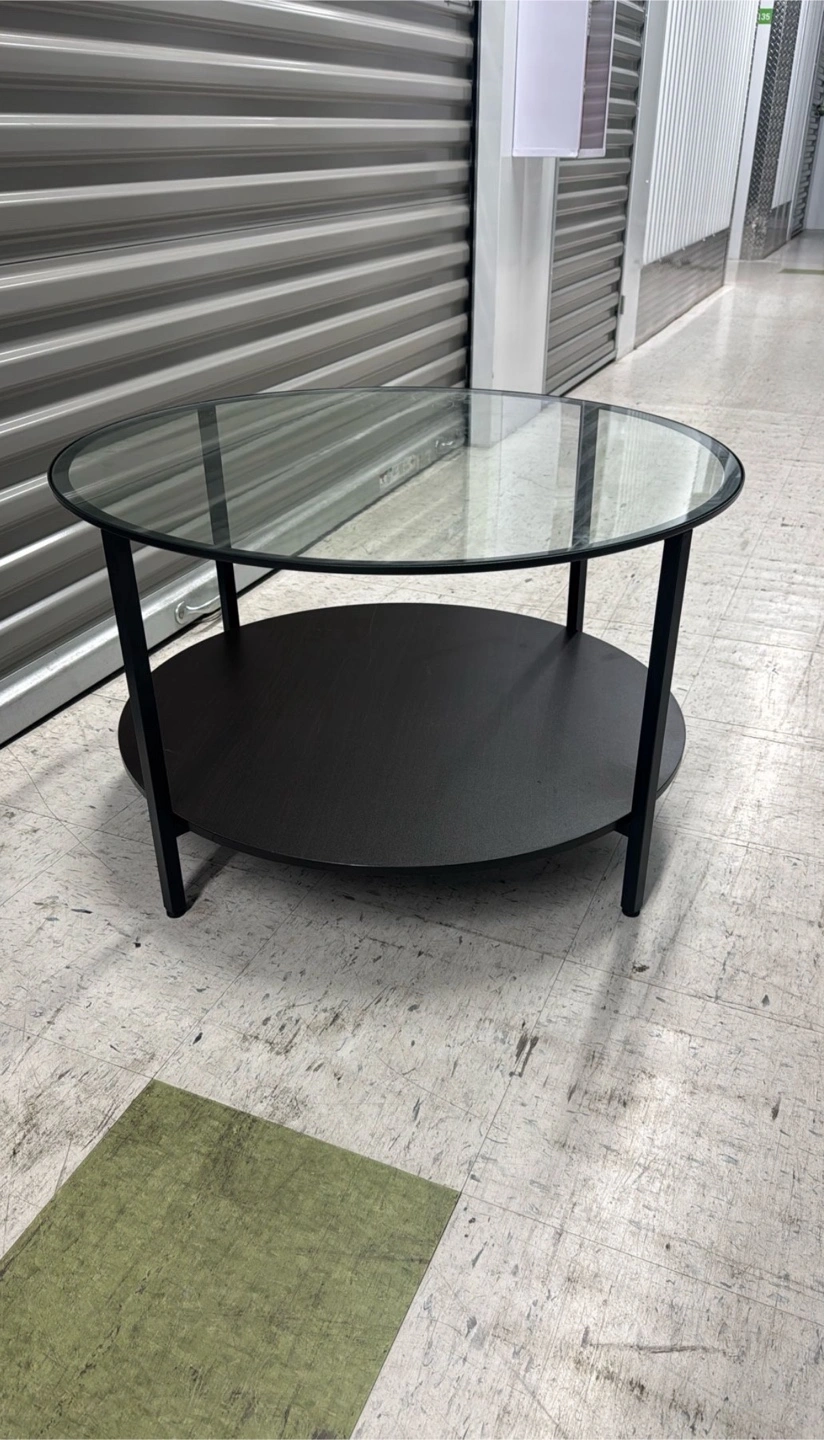 Selling a round coffee table with a glass top and a lower shelf. The frame and shelf are black. It's in good condition and would be a great addition to any living room