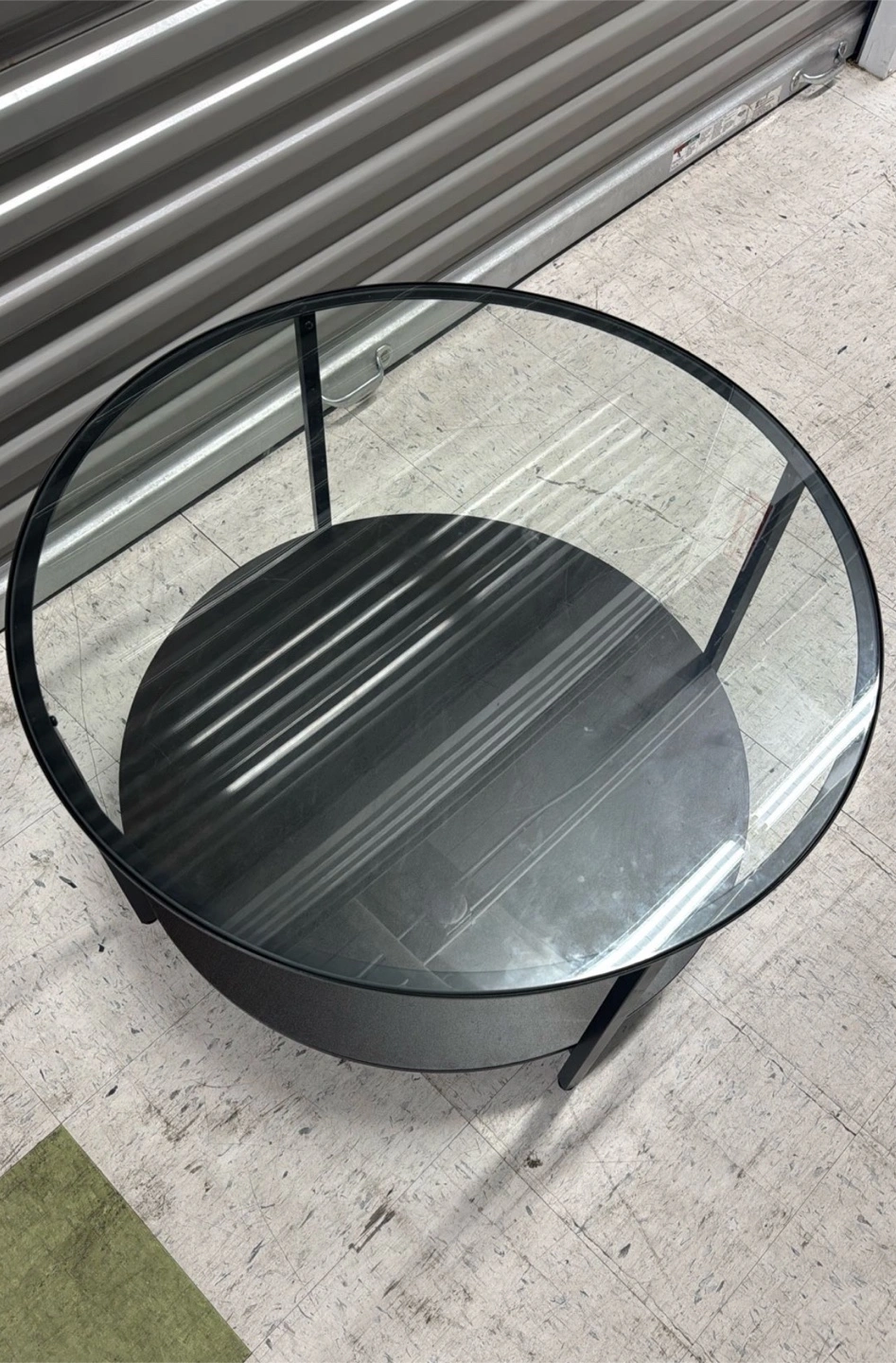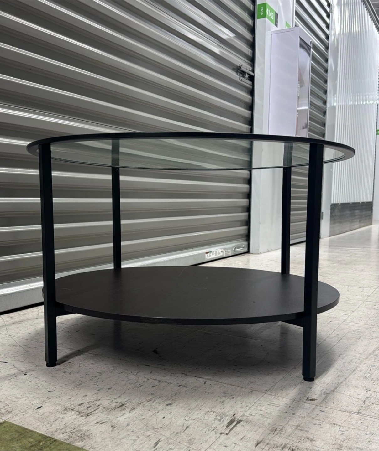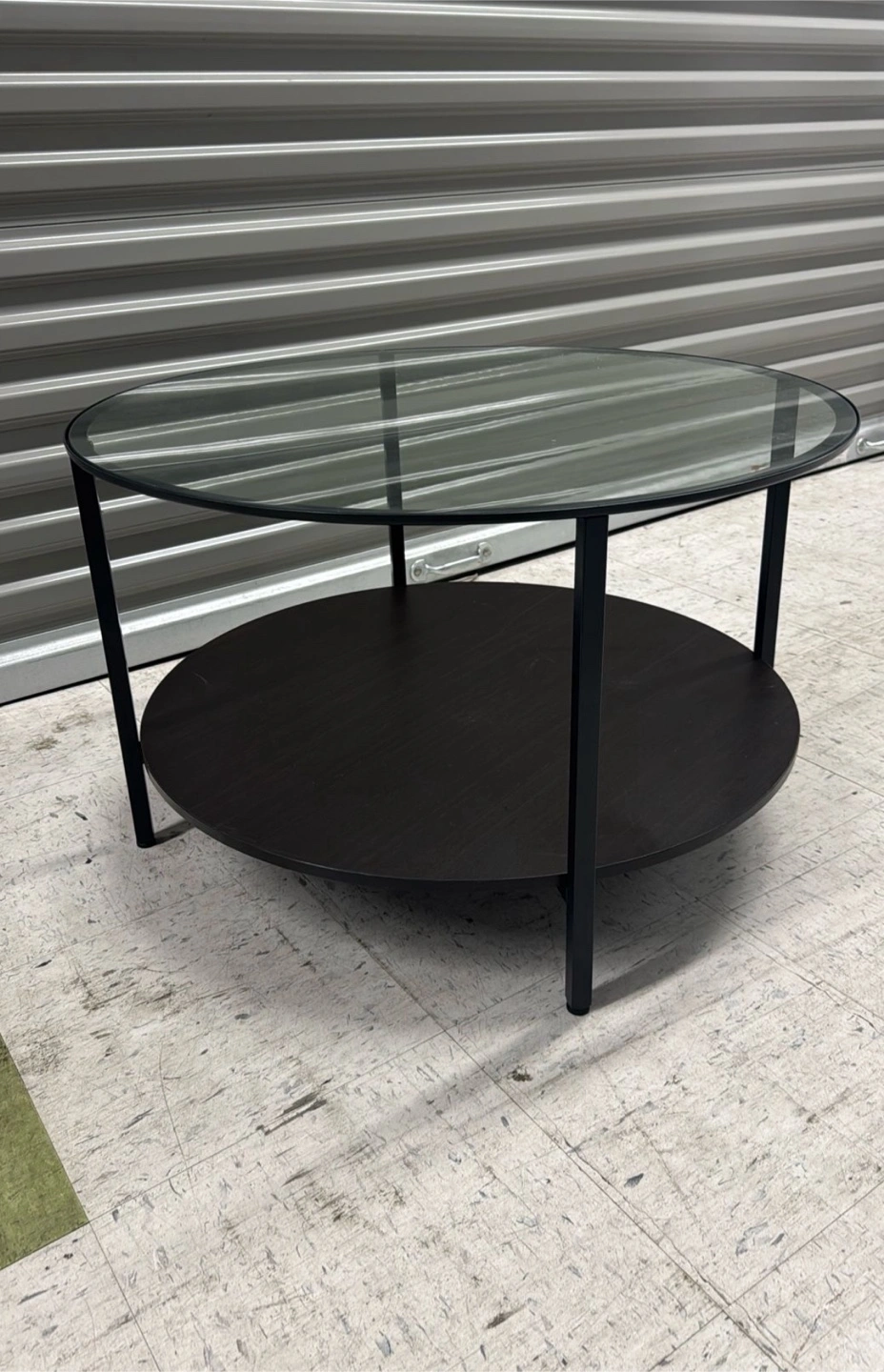 Selling a round coffee table with a glass top and a lower shelf. The frame and shelf are black. It's in good condition and would be a great addition to any living room