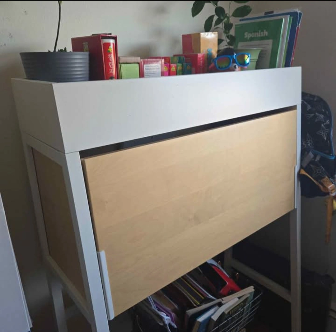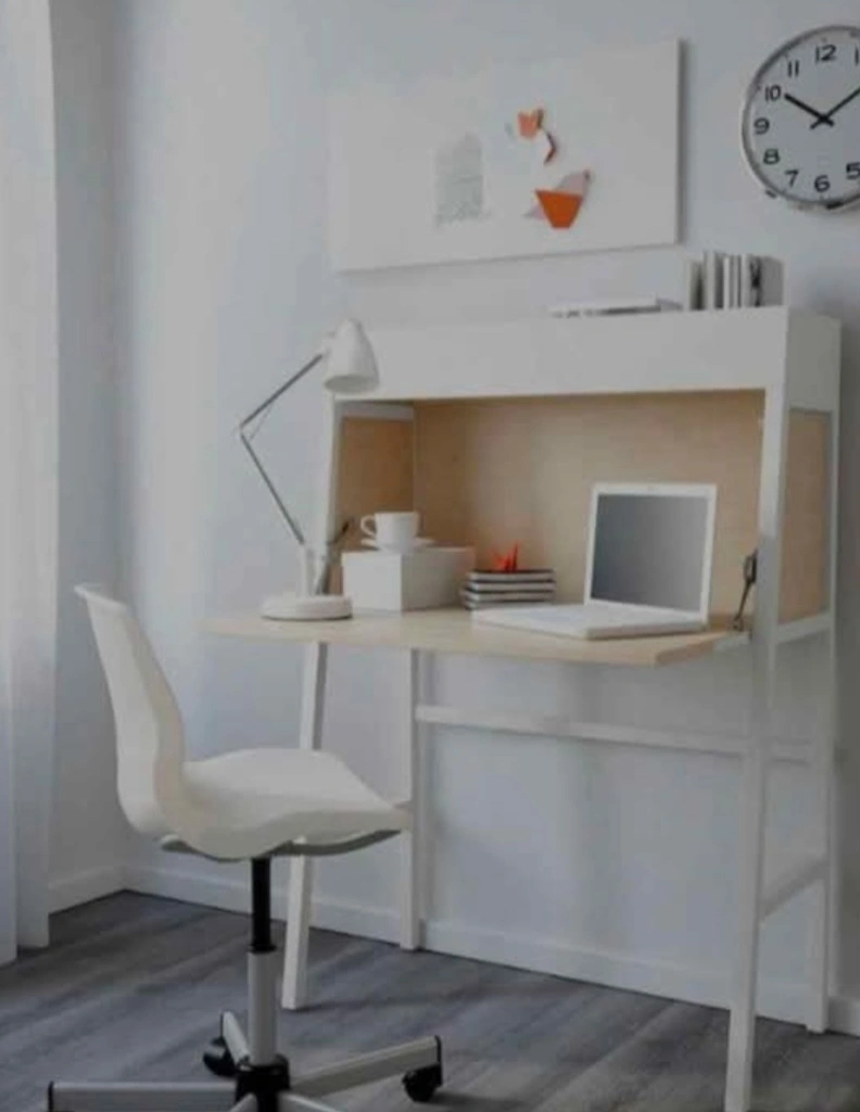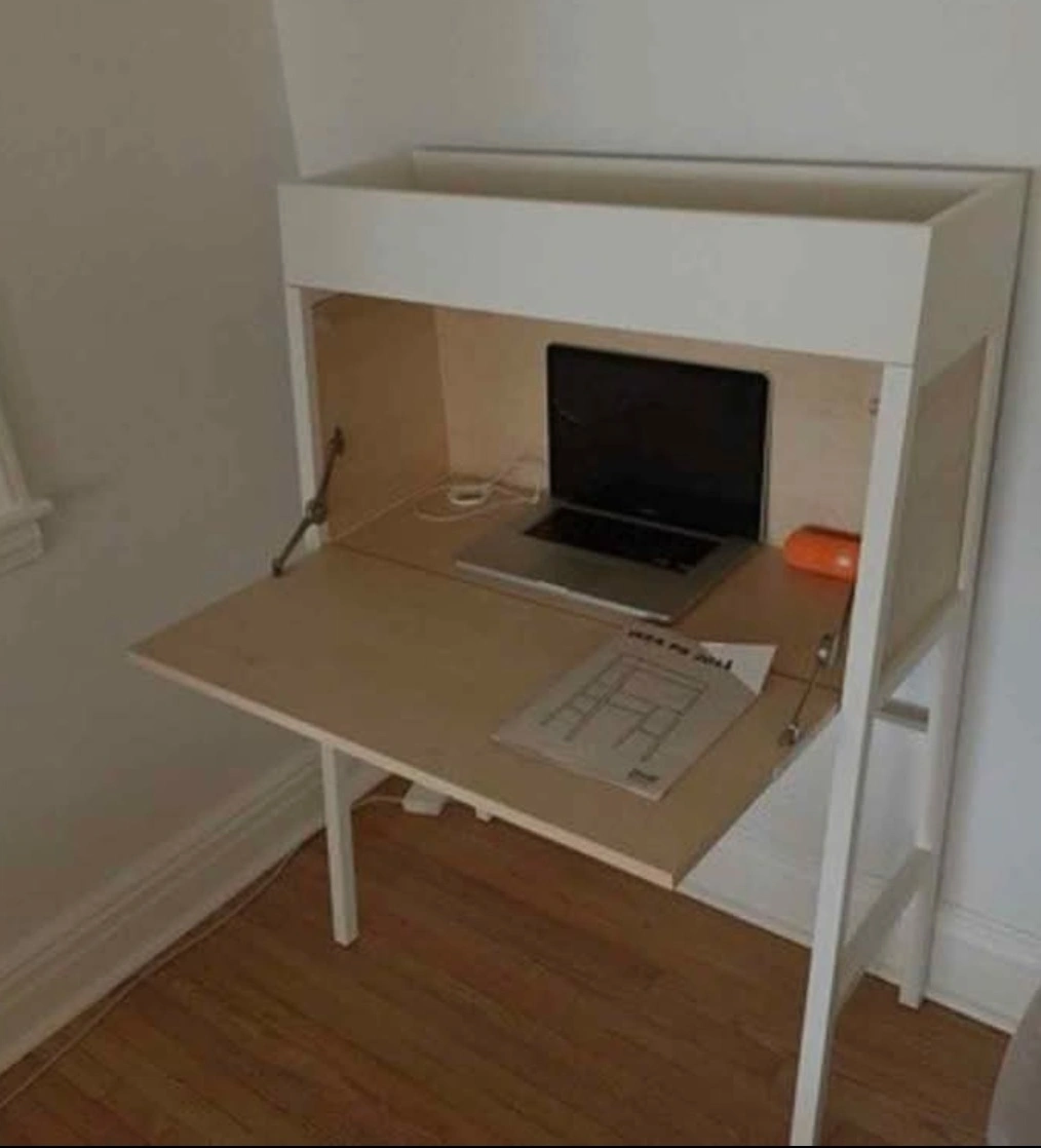 77Foldable Secretary Desk in Good Condition. Already assembled. pick up only. Dimensions: 35.5” wide, 49.5” tall, 17” deep on the bottom, 11” deep in top, 26.75” deep when the desk part is open. Has an opening in the corner for computer cords, etc. and a nice deep shelf on top. A few very minor scratches but barely noticeable and push pin holes inside the top edge.