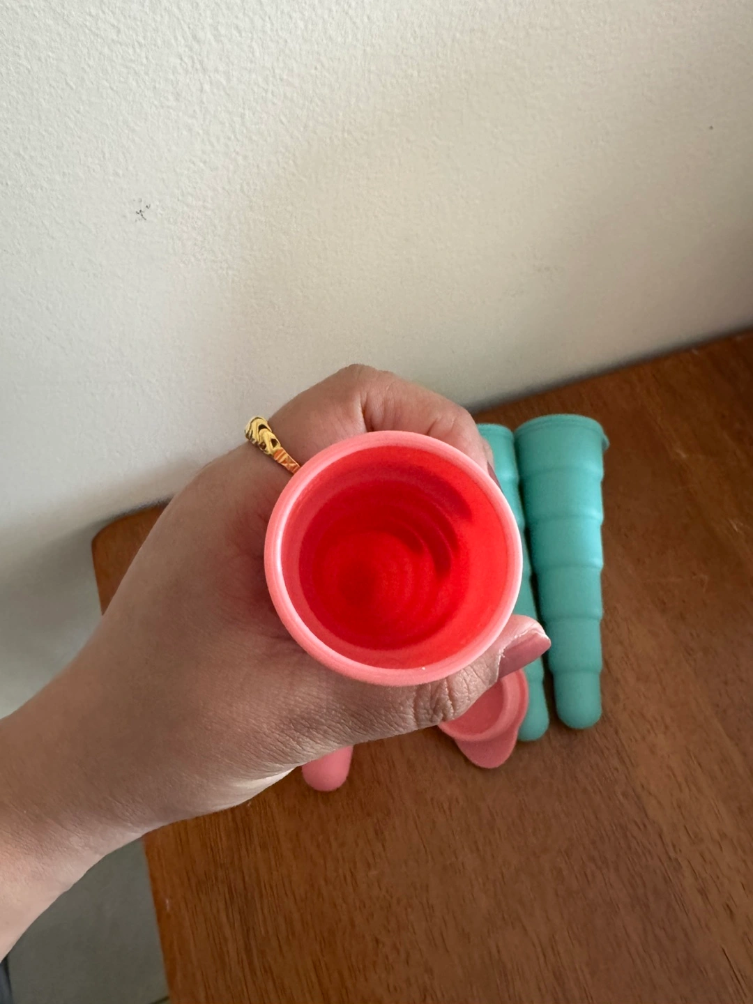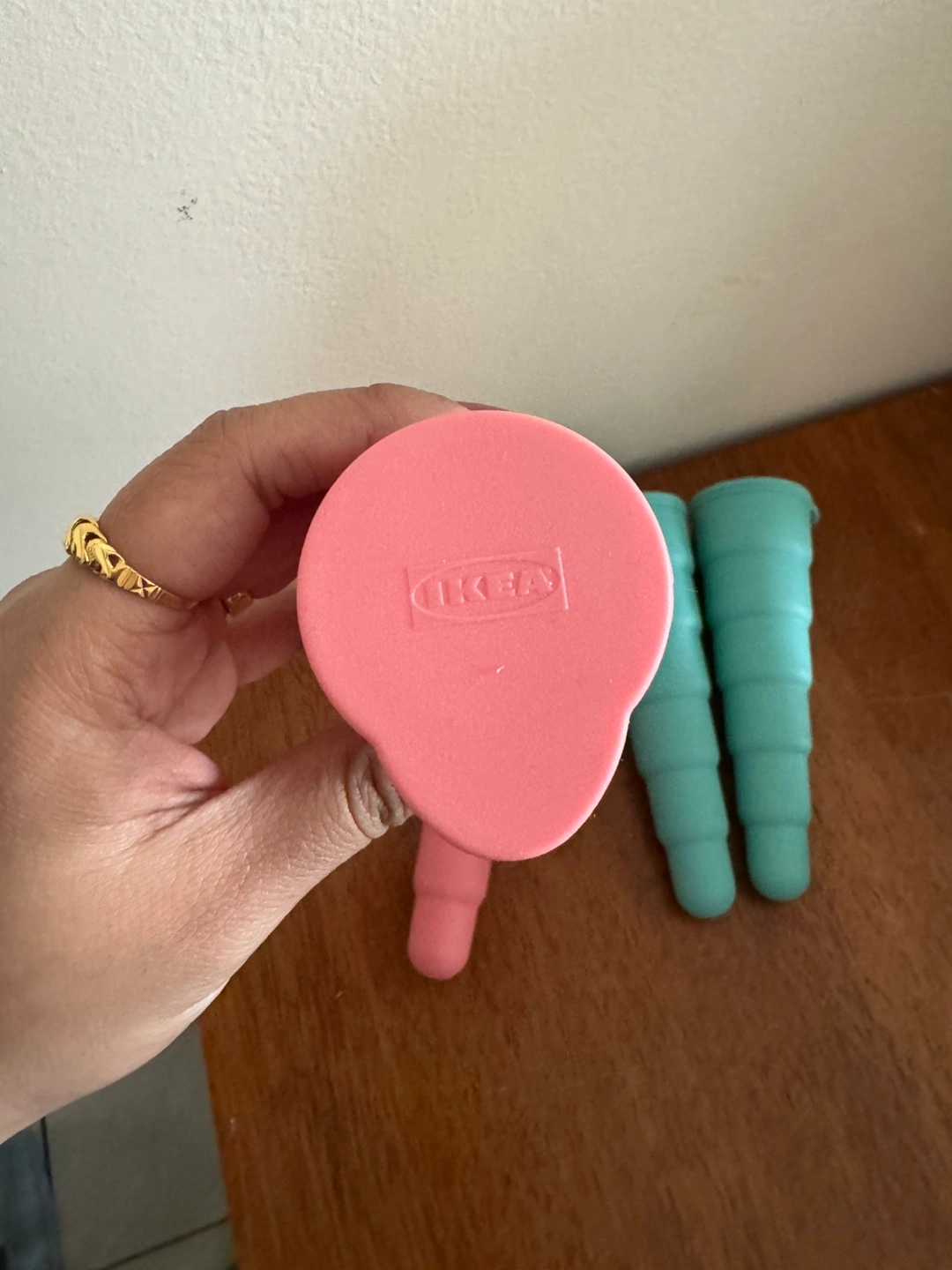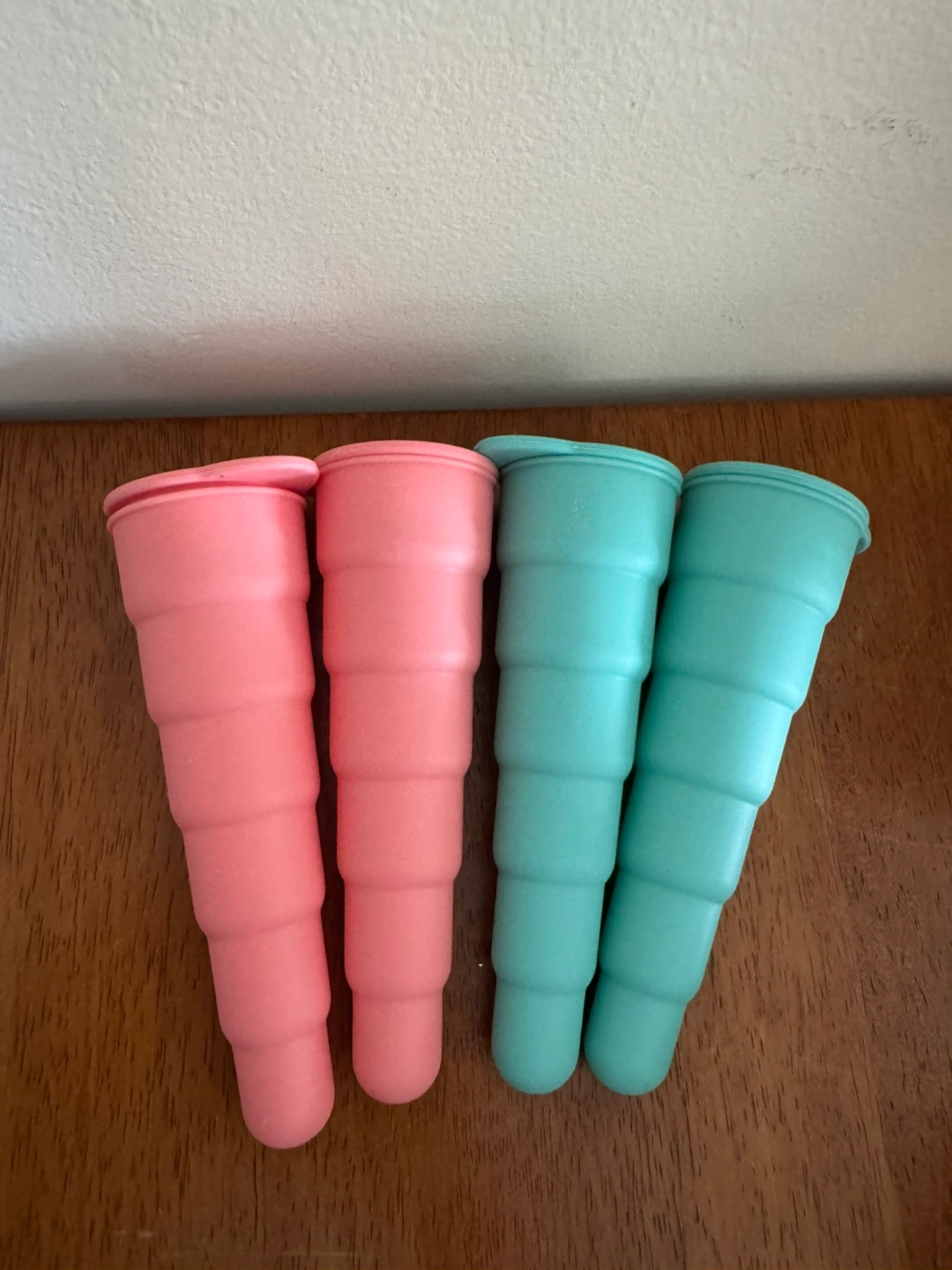 26Set of four silicone popsicle molds. Two pink, two teal. Easy to clean and reusable. Great for summer treats.
