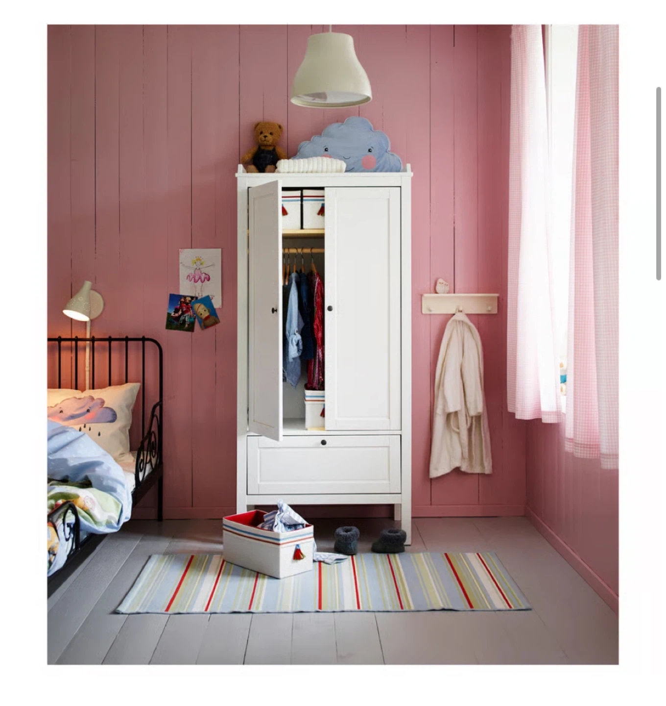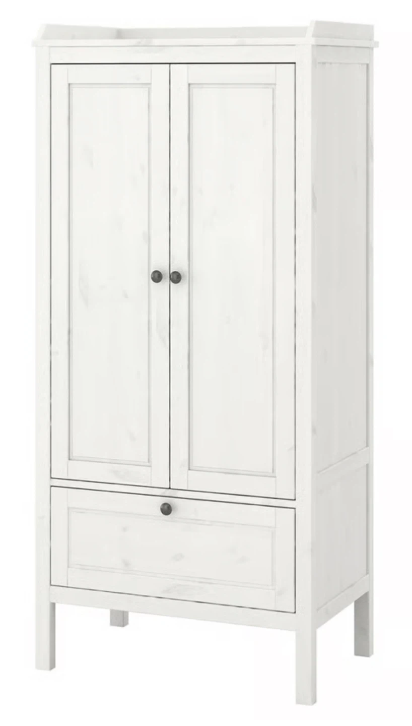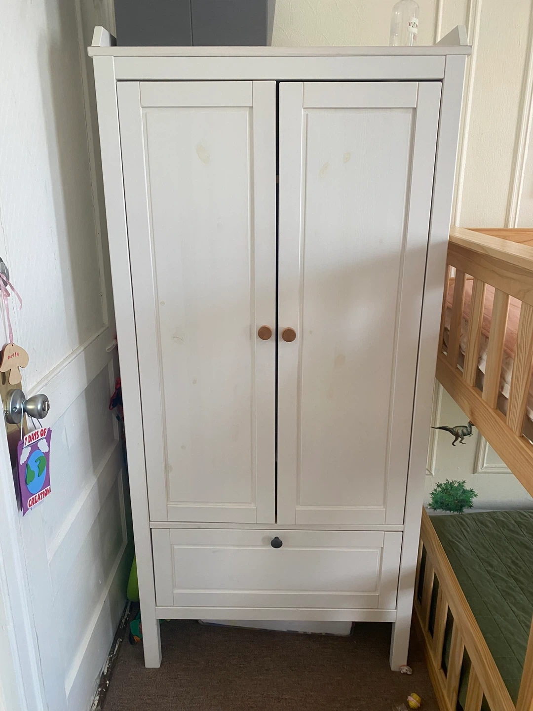 Selling a white IKEA SUNDVIK Wardrobe, white, wardrobe! 31 1/2x19 5/8x67 3/8 " It's perfect for kids' rooms and provides great storage. The wardrobe has two doors and a drawer at the bottom. It's in good condition and ready for a new home