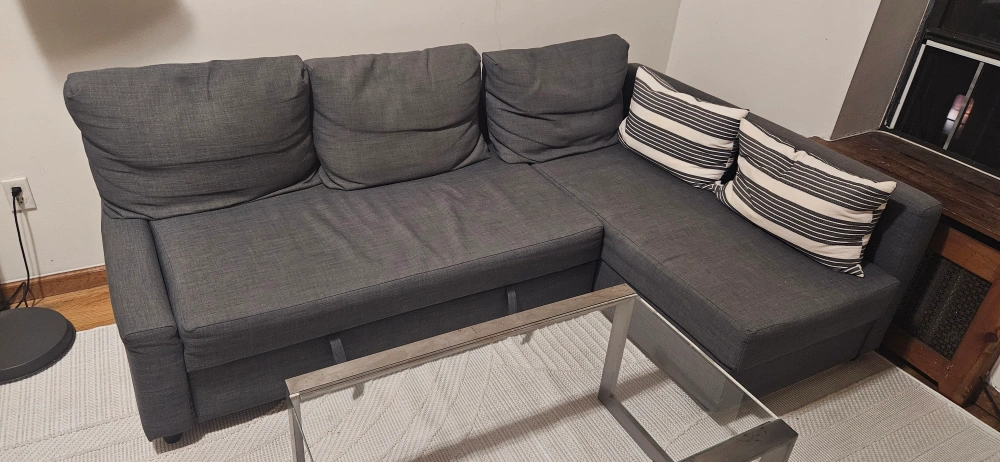 • Sleeper sectional - very comfortable and easy to open / close • 3 seat w/storage • Brand: IKEA FRIHETEN • Very minor stains and color changes. • Price new: 799 USD Pick-up 3 floors up, no elevator, can help bri ging it down. Can be disassembled. • Dimensions (see picture) Depth: 59 1/2 " Bed width: 55 1/8 " Bed length: 80 3/8 " Height including back cushions: 33 7/8 " Backrest height: 26 " Width: 90 1/2 "