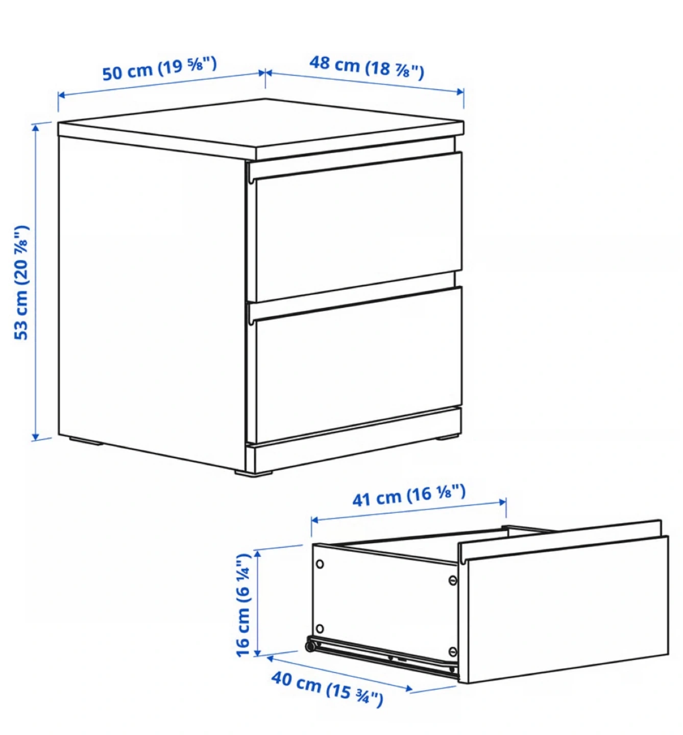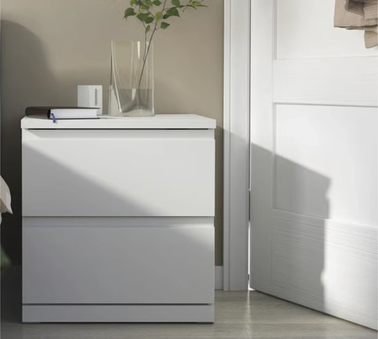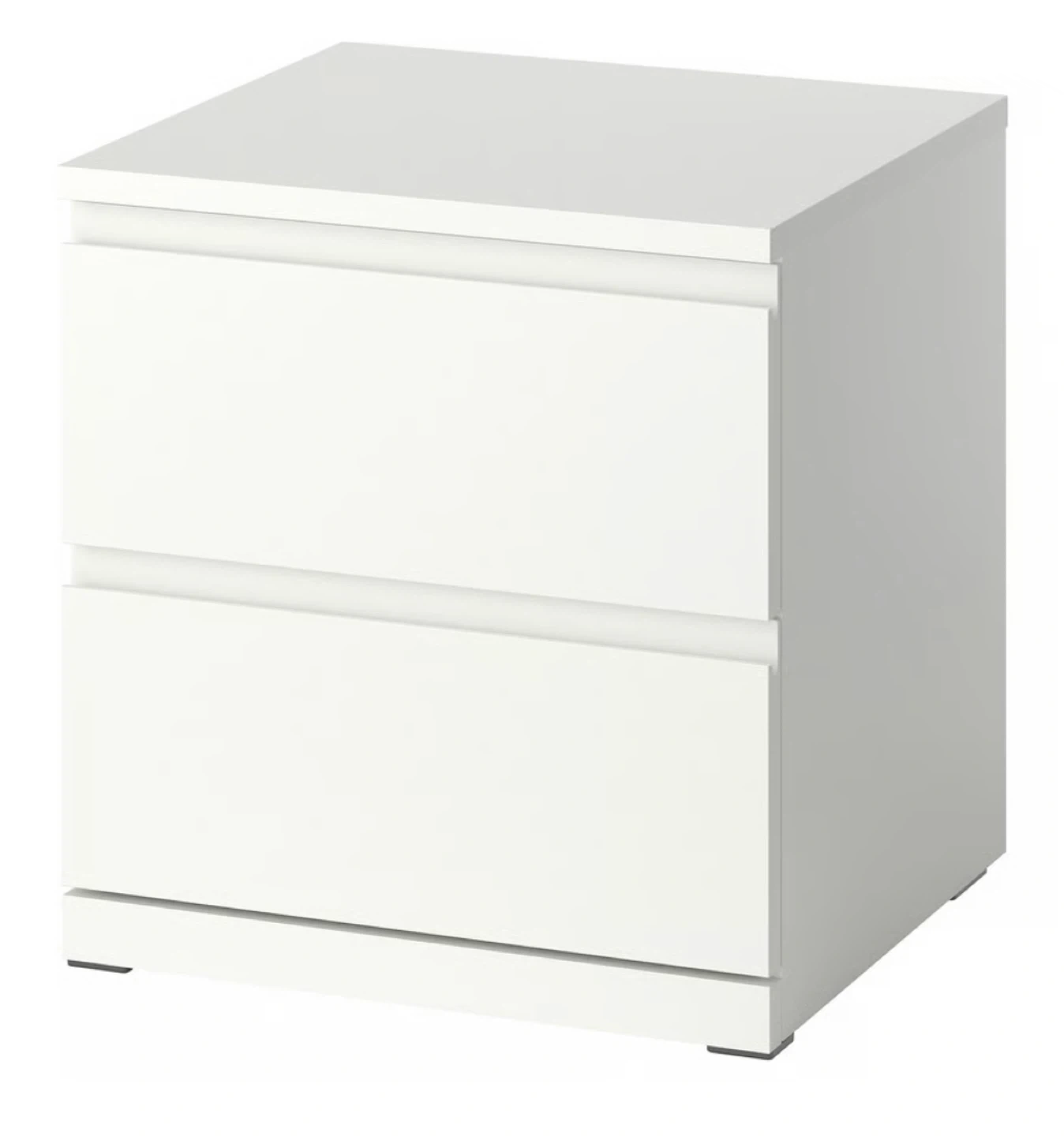 Selling a white IKEA STORKLINTA nightstand. It has two drawers for storage. Dimensions are approximately 19 5/8" wide, 18 7/8" deep, and 20 7/8" high. Perfect for your bedside needs!