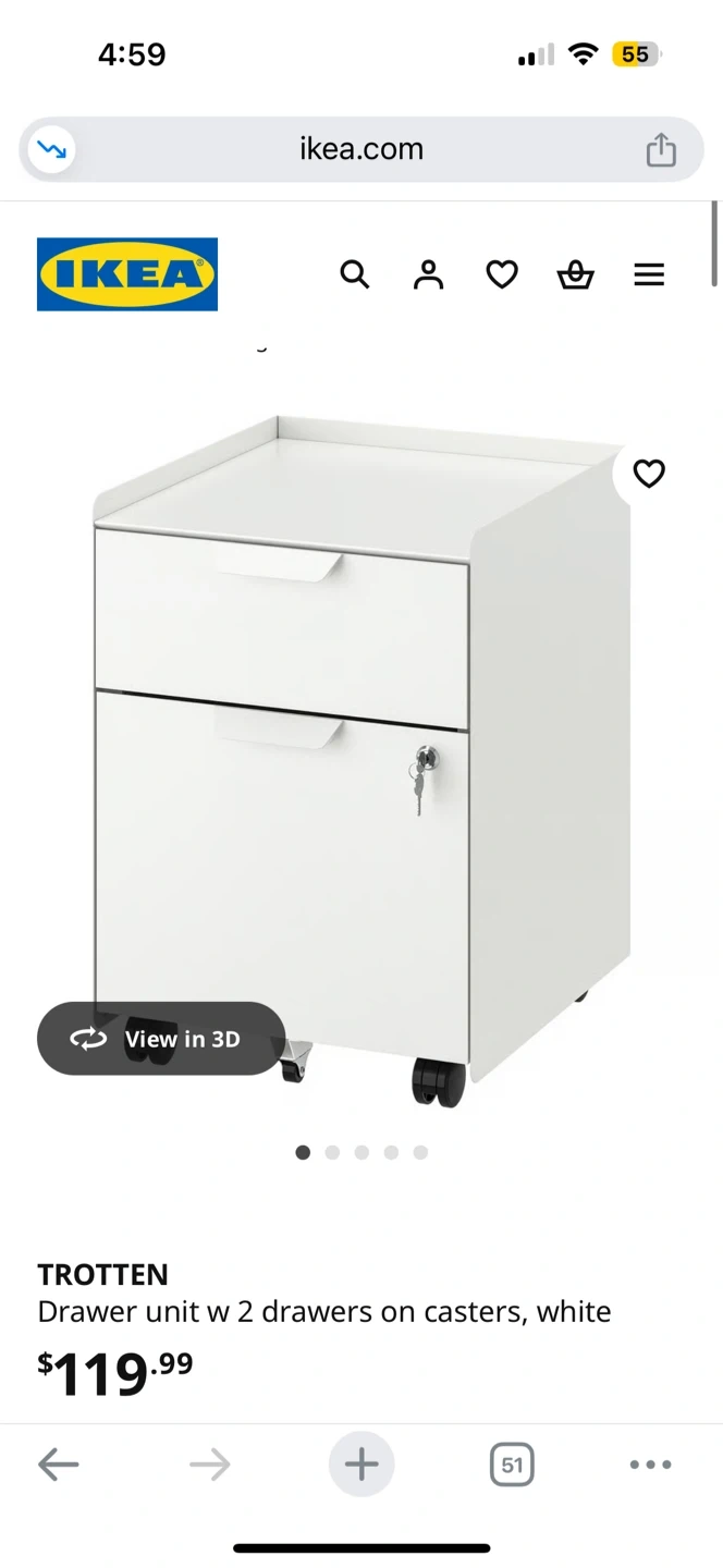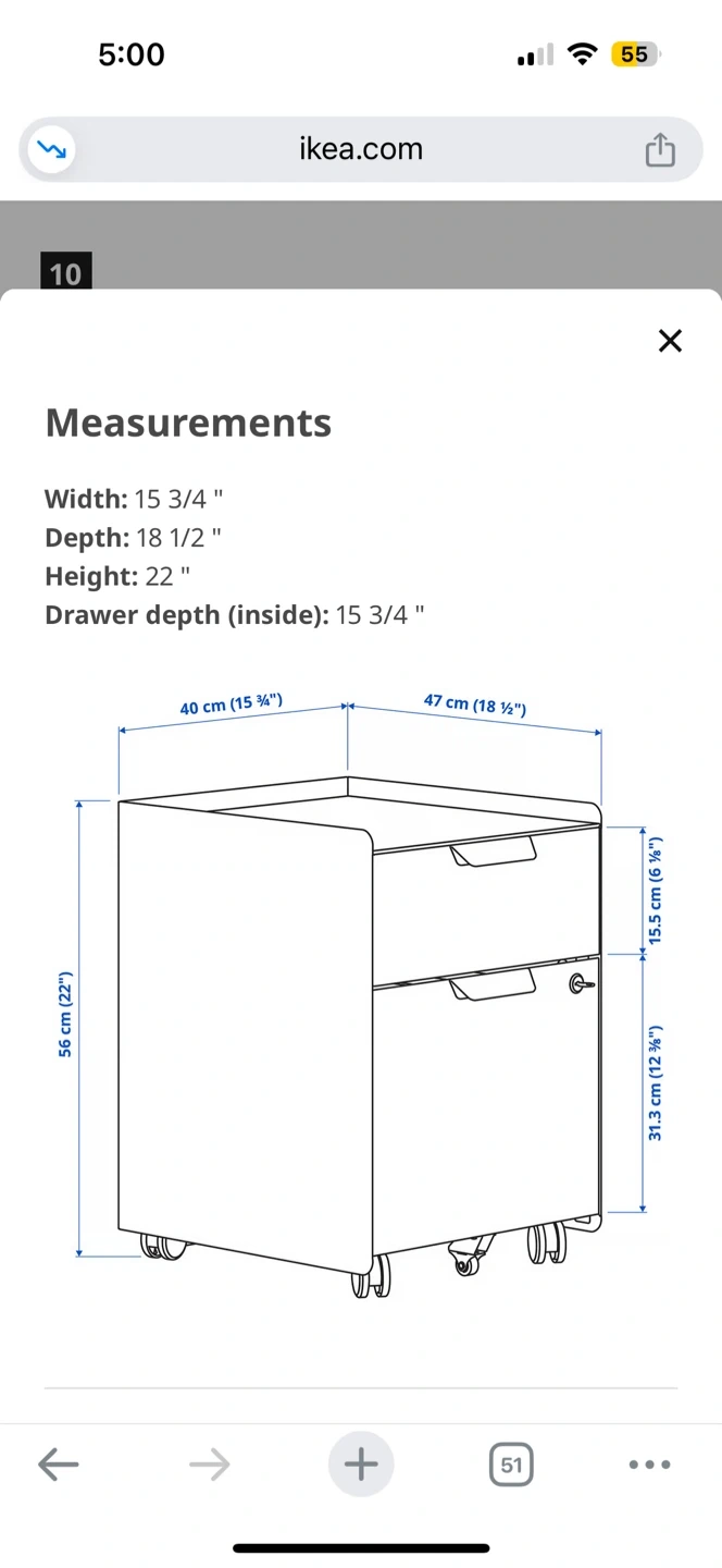 18Looking to sell an IKEA Trotten drawer unit in white. It comes with two drawers and casters for easy mobility. Here are the measurements: - Width: 15 3/4 " - Depth: 18 1/2 " - Height: 22 " - Drawer depth (inside): 15 3/4 "