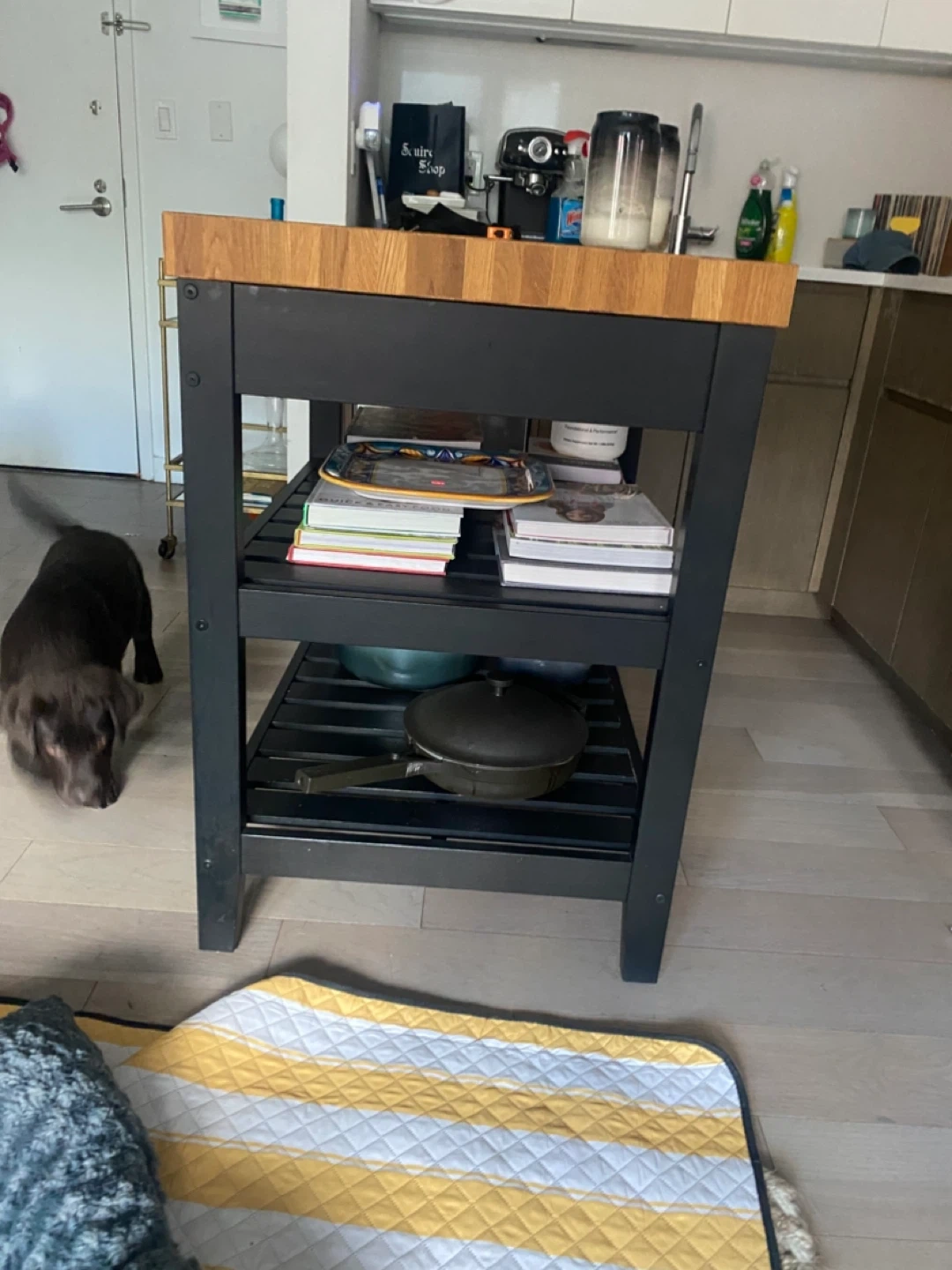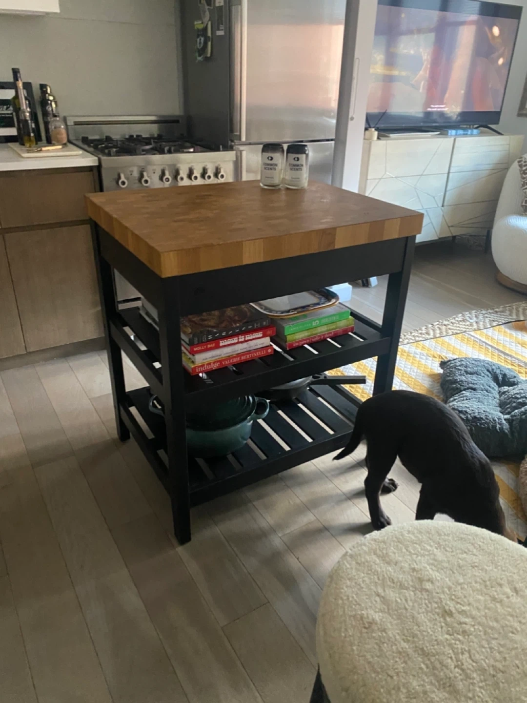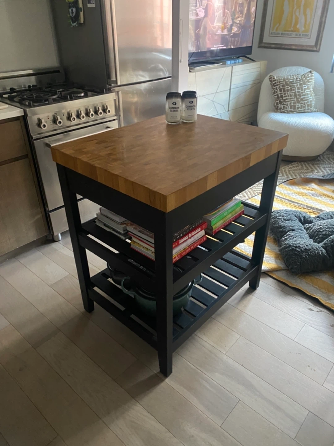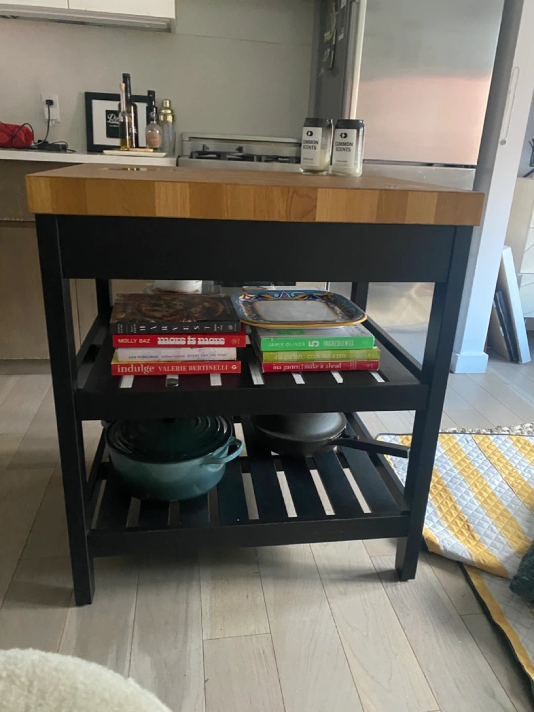 I'm selling an IKEA VADHOLMA kitchen island in black and oak. It's in great condition and ready for a new home! The dimensions are 31 1/8x24 5/8x35 3/8 ". Originally bought for $349 - selling for $100. Easy pick up with elevator & dolly.