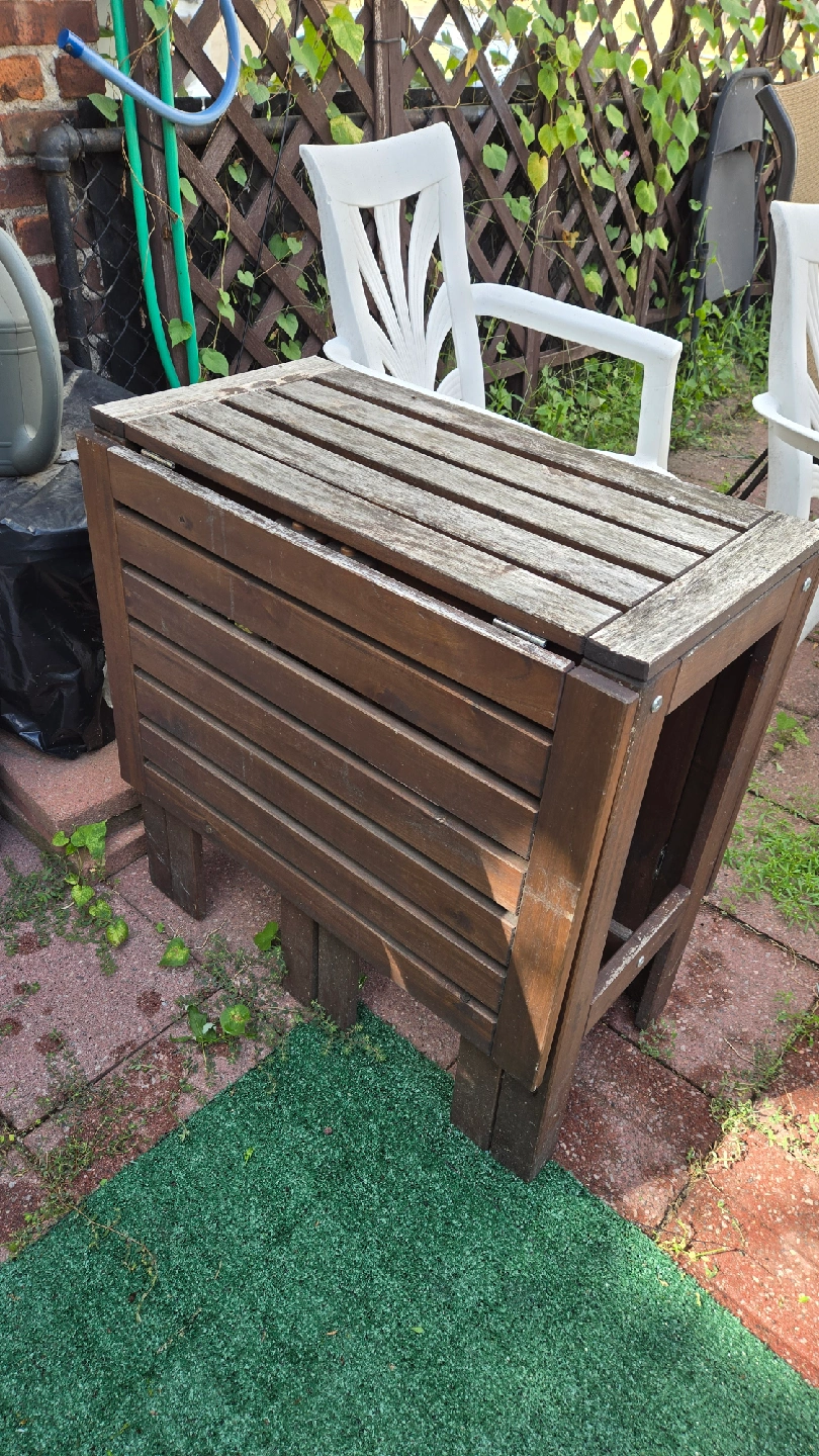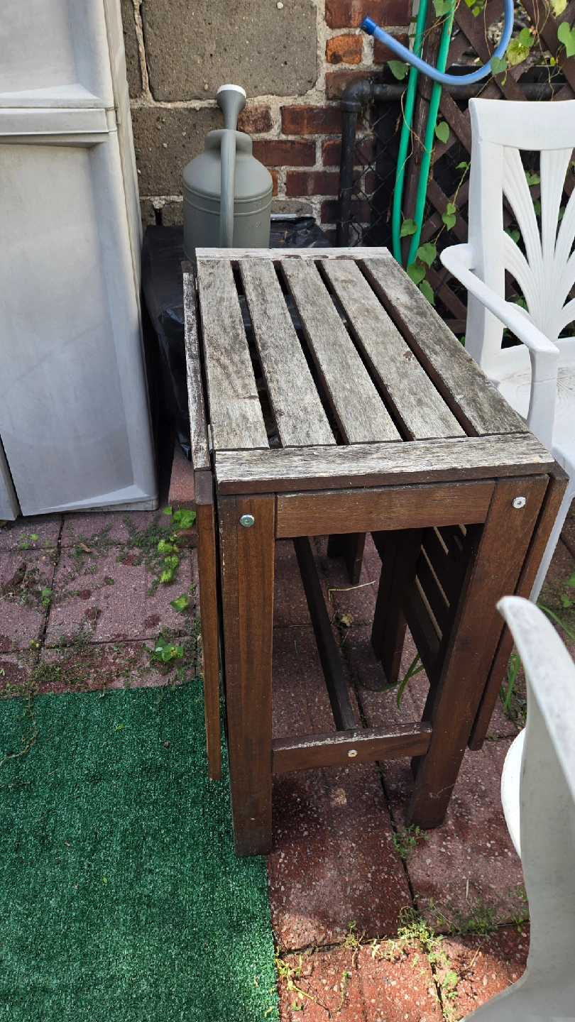 Selling a wooden outdoor folding table! It's perfect for small spaces and easy to store when not in use. The table shows some signs of wear, but it's still sturdy and functional. It would be great for a patio, balcony, or small garden