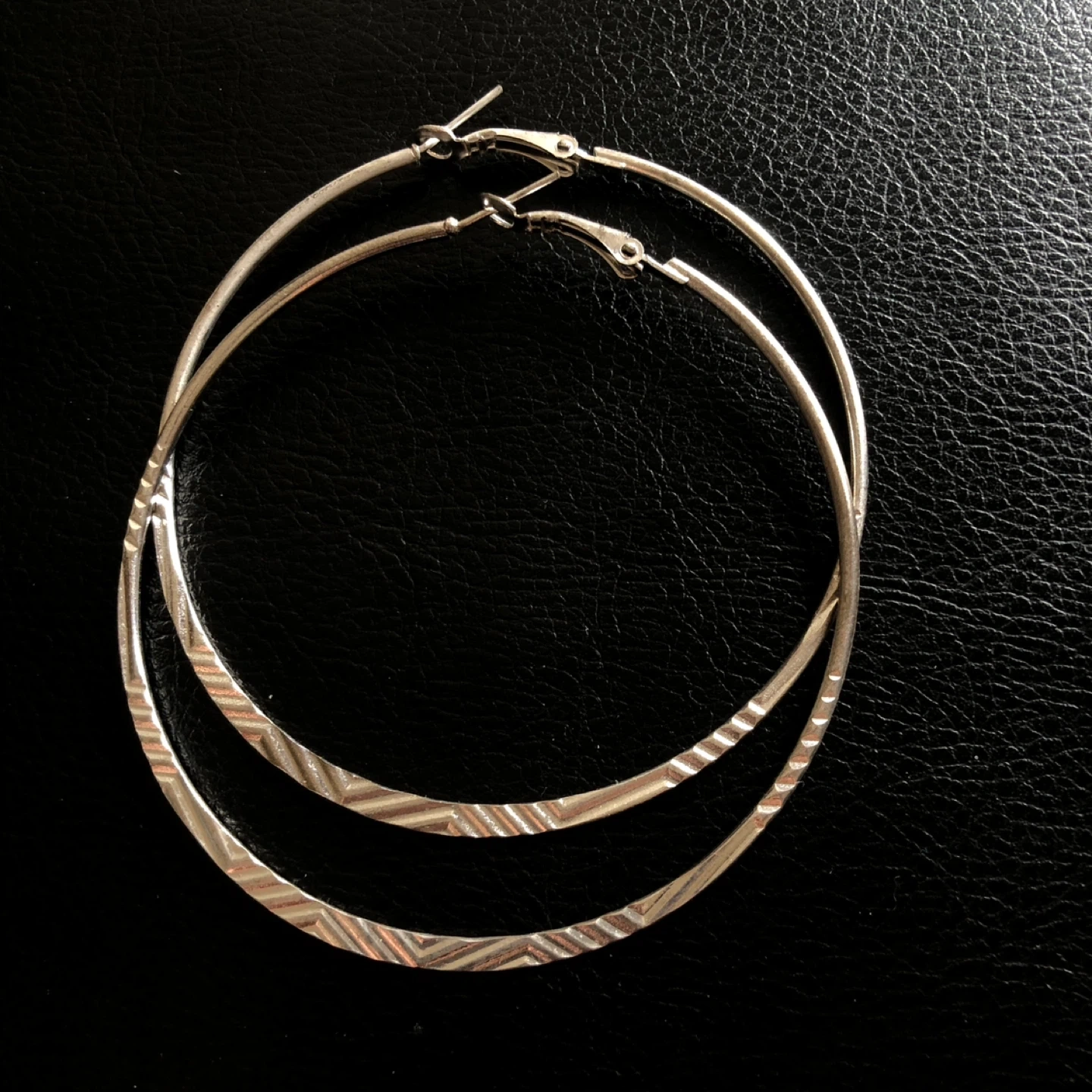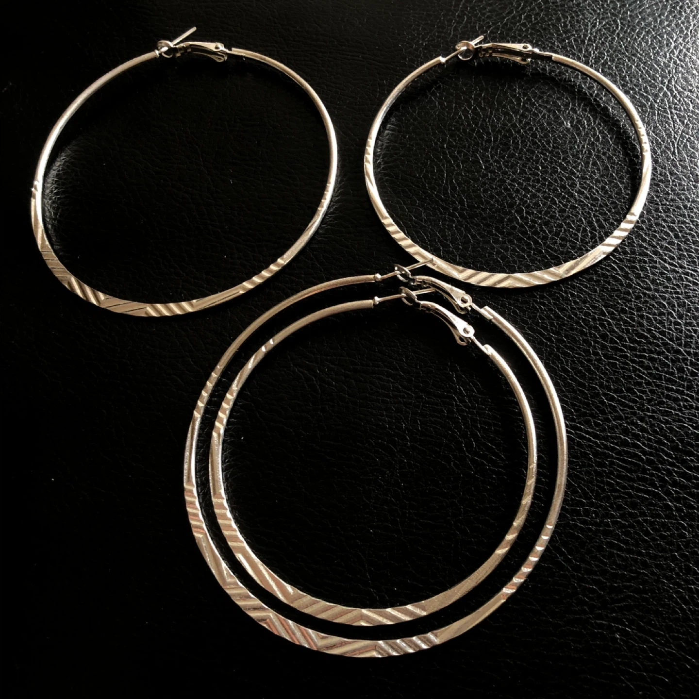 This set includes two pairs of silver toned hoop earrings. They feature a textured design along the hoops. Lightweight and stylish for everyday wear!