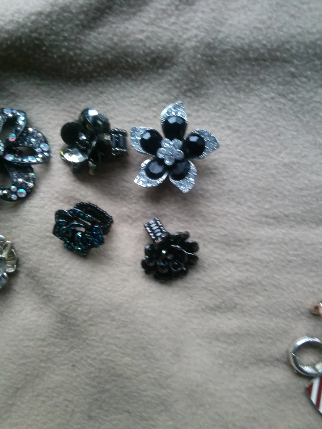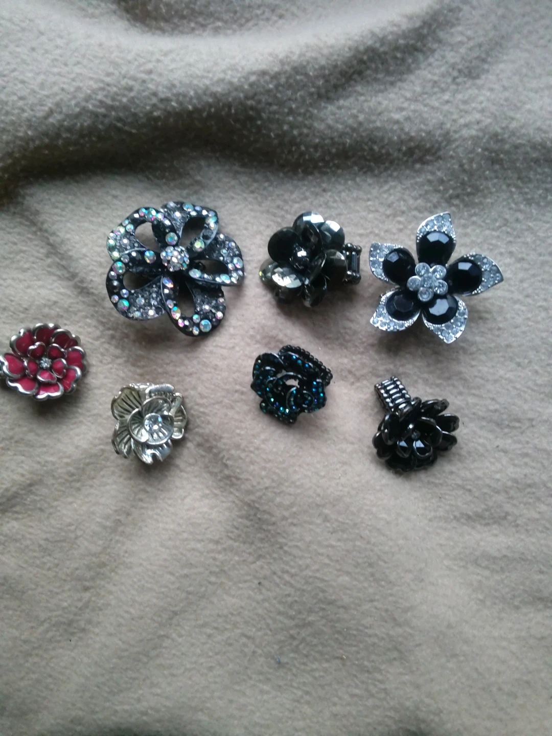 This set includes seven decorative buttons or charms, all designed with a flower motif. They vary in color and embellishment, featuring metallic finishes, rhinestones, and detailed petal designs. These can be used to add flair to clothing, bags, or craft projects.