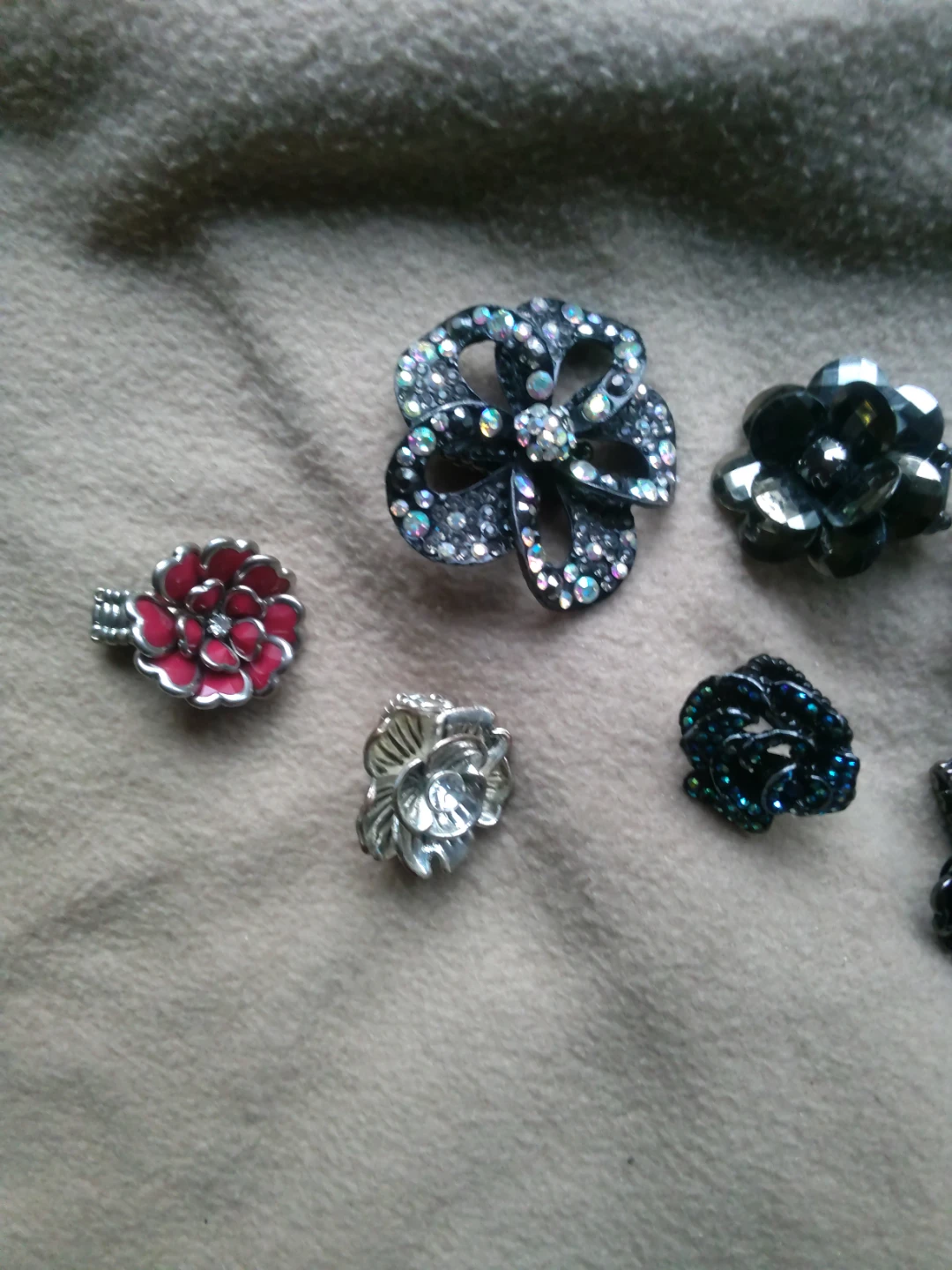 This set includes seven decorative buttons or charms, all designed with a flower motif. They vary in color and embellishment, featuring metallic finishes, rhinestones, and detailed petal designs. These can be used to add flair to clothing, bags, or craft projects.