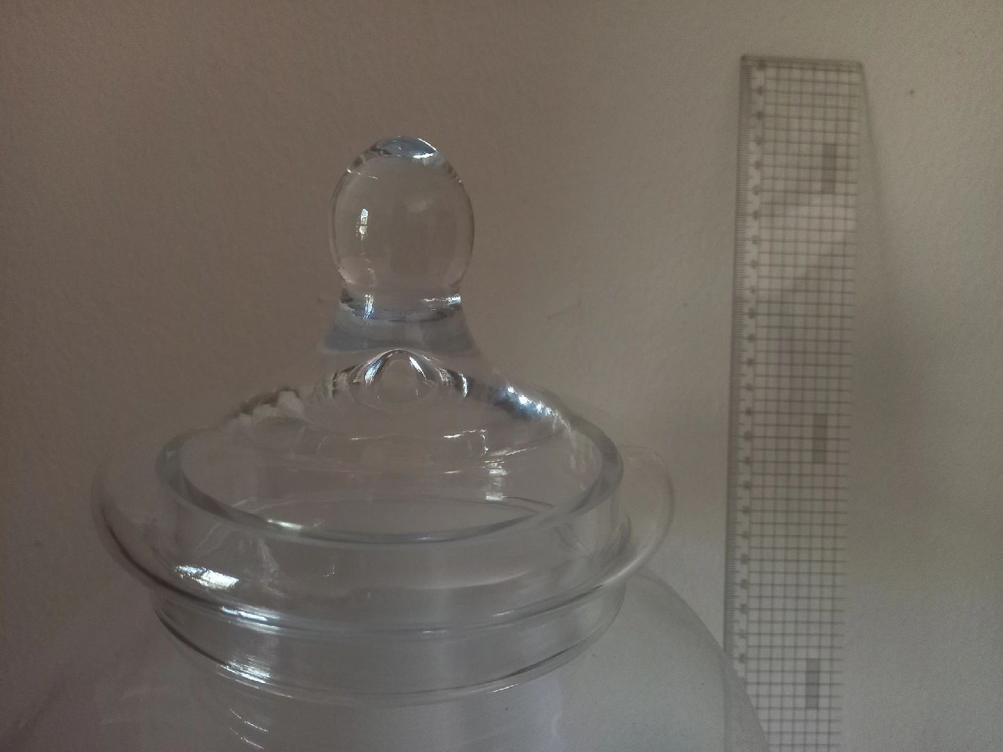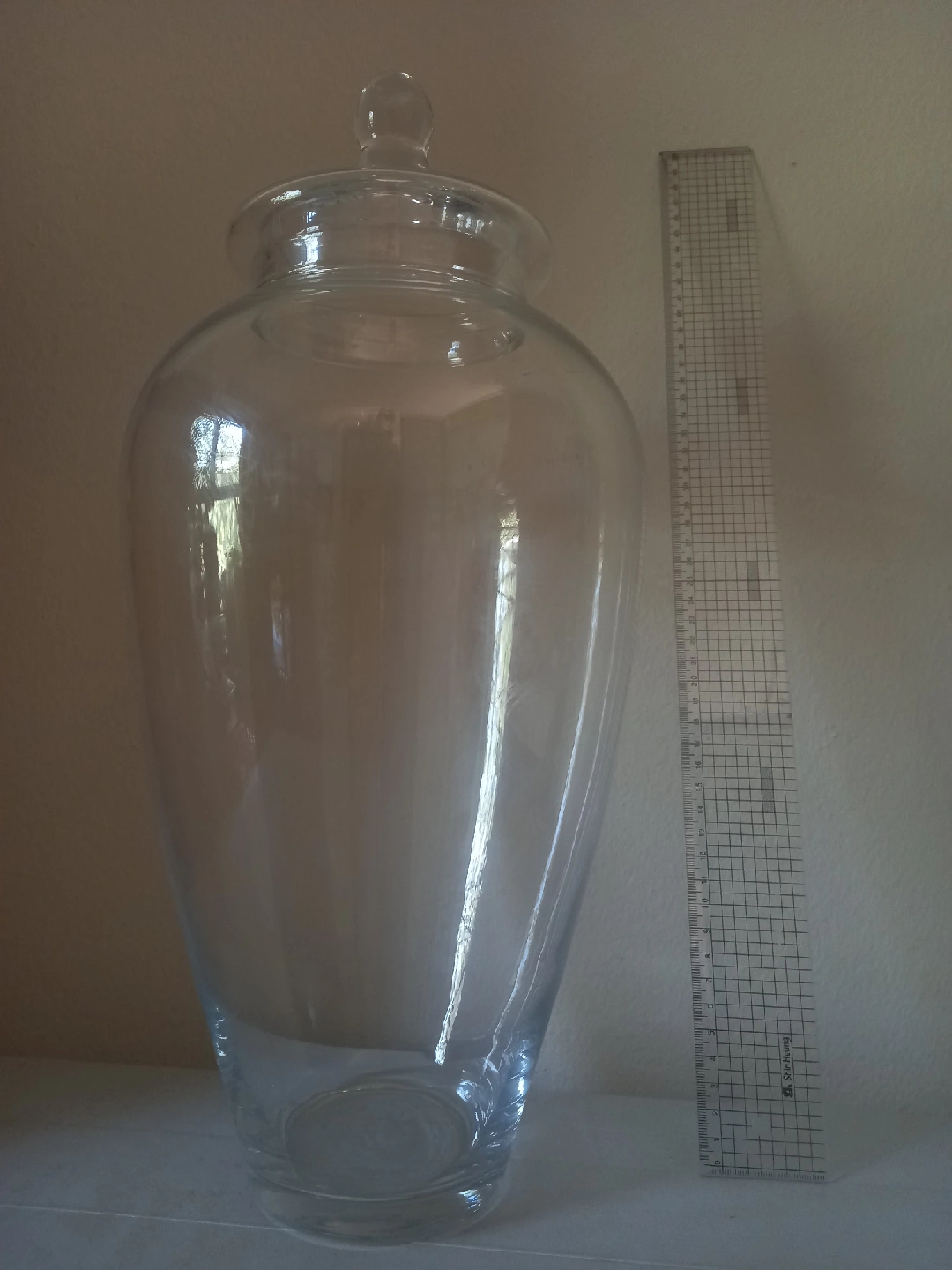 Selling a large glass apothecary jar with a lid. It's perfect for storing various items or as a decorative piece. The jar is clear glass and in great condition. The ruler in the picture shows the approximate size