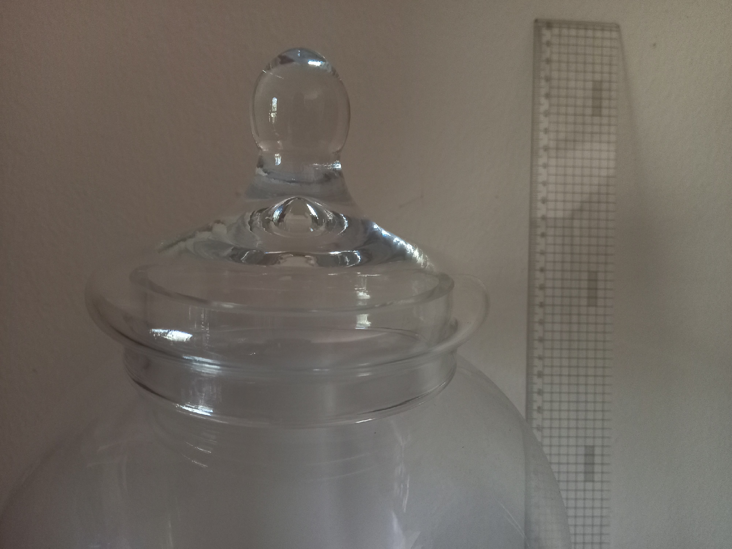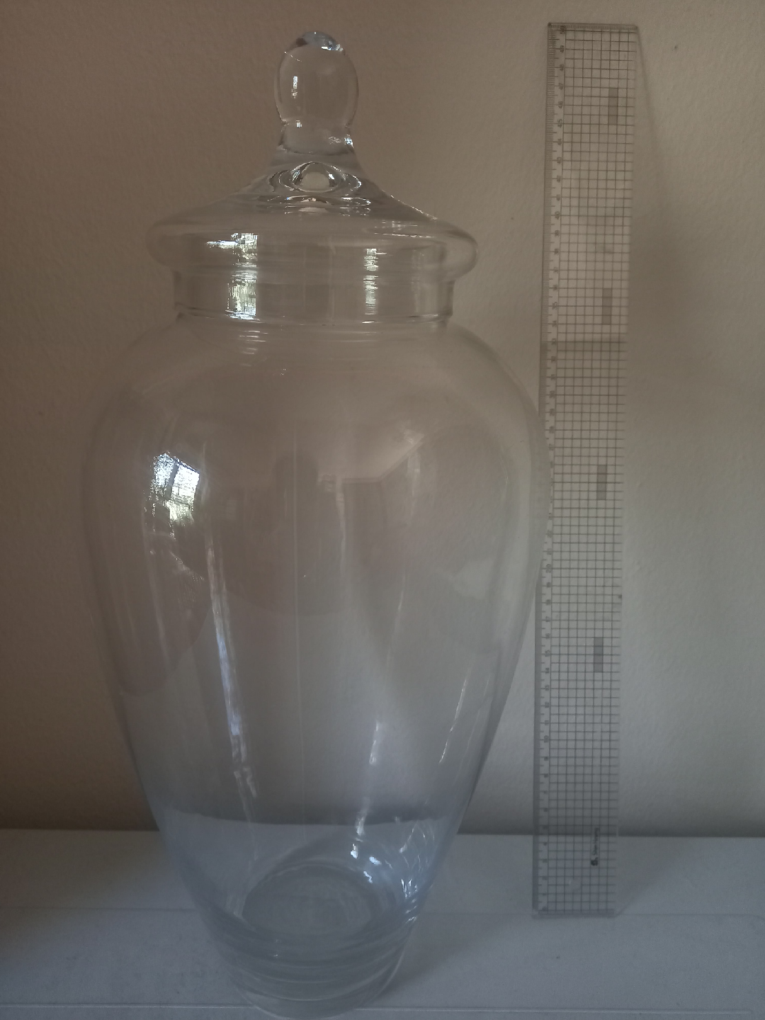 Selling a large glass apothecary jar with a lid. It's perfect for storing various items or as a decorative piece. The jar is clear glass and in great condition. The ruler in the picture shows the approximate size