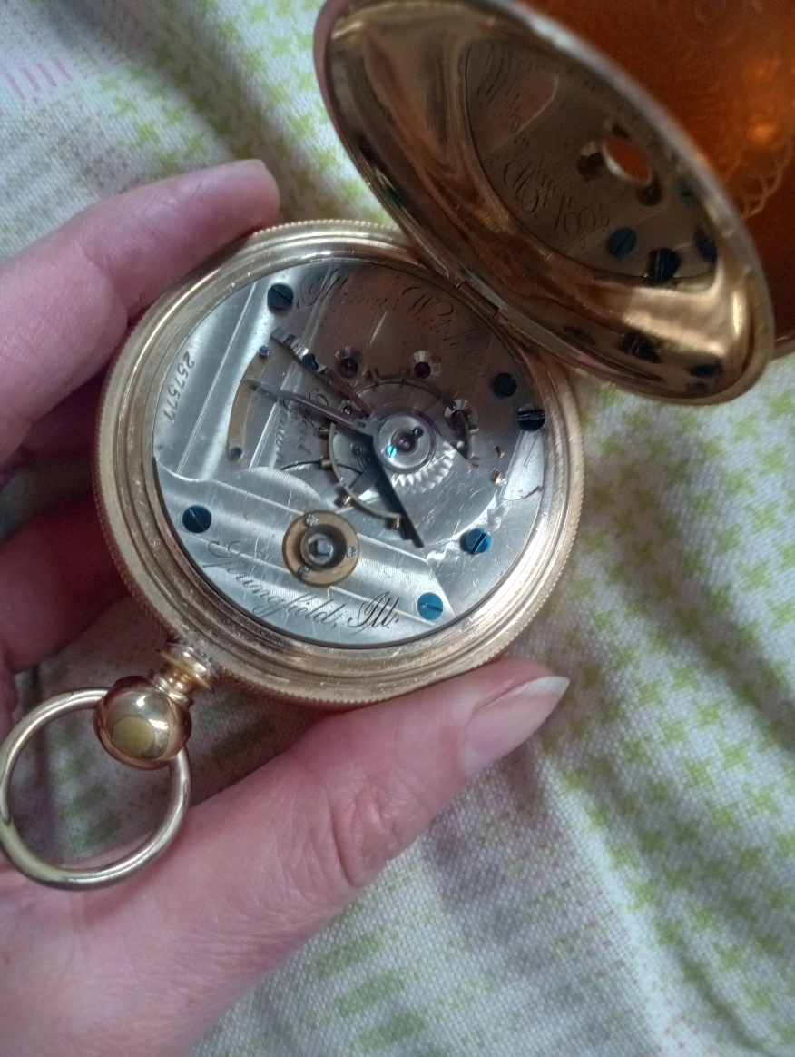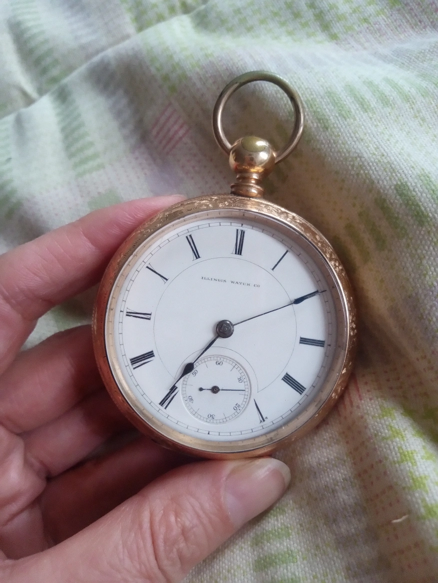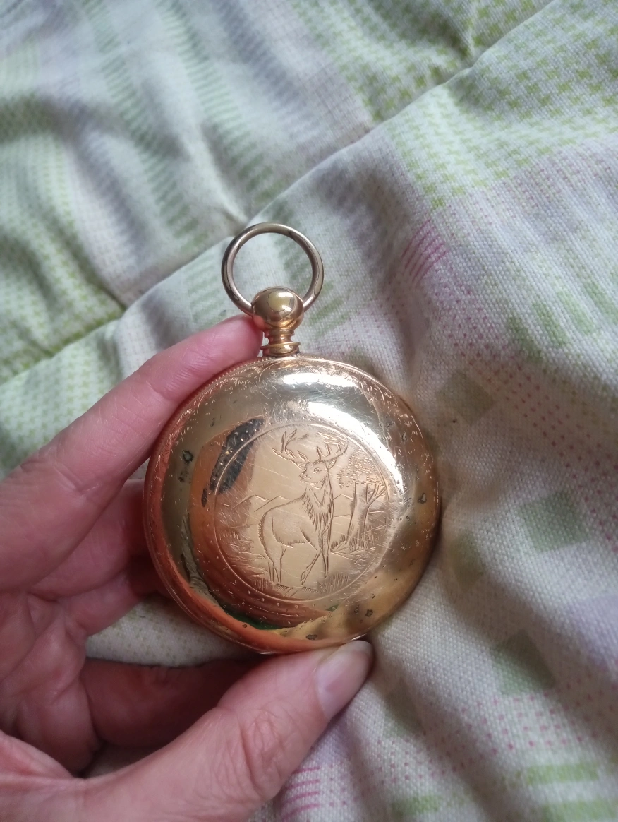 Made in 1882. Works with a key. Still ticking! Gold fill case with a nice buck engraving on the back.