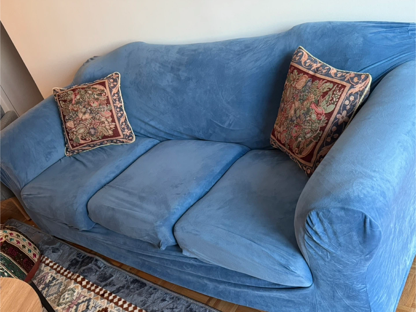 Large Ashley Furniture 3-seater in good condition. Extremely comfortable with minimal wear. It has a dark brown fabric (see photo), but comes with an optional super soft blue cover (brand new added only 6 months ago) that gives it a fresh, updated look.